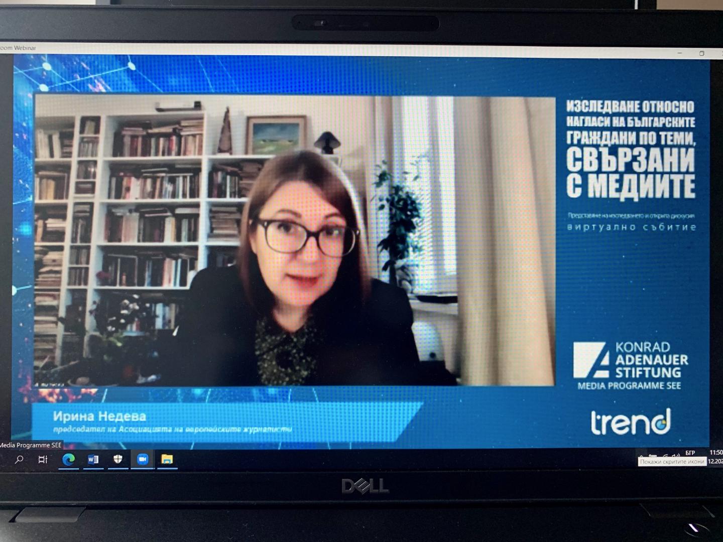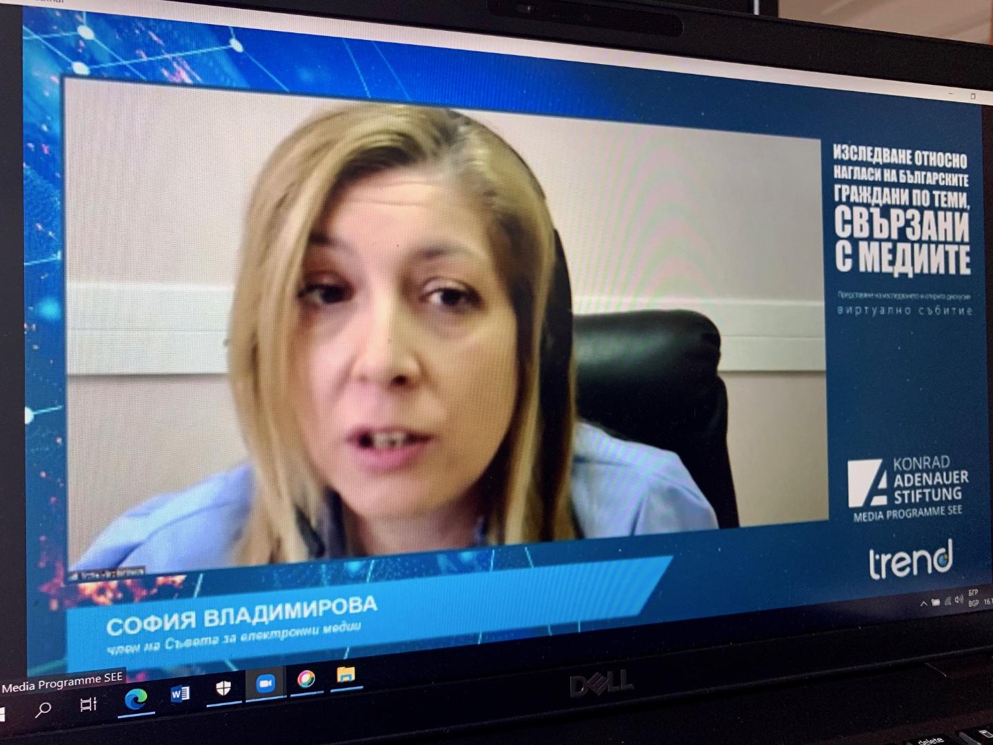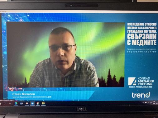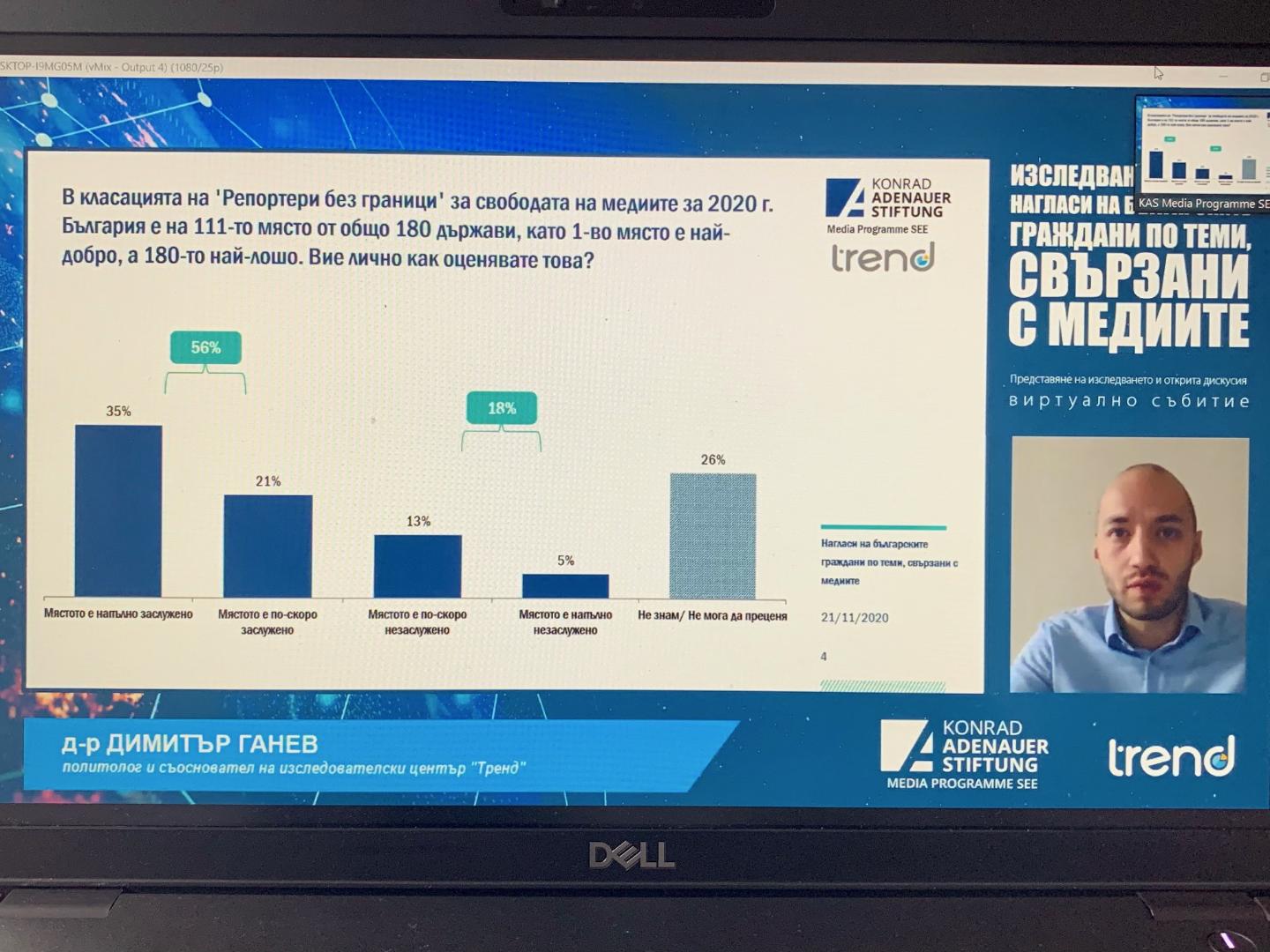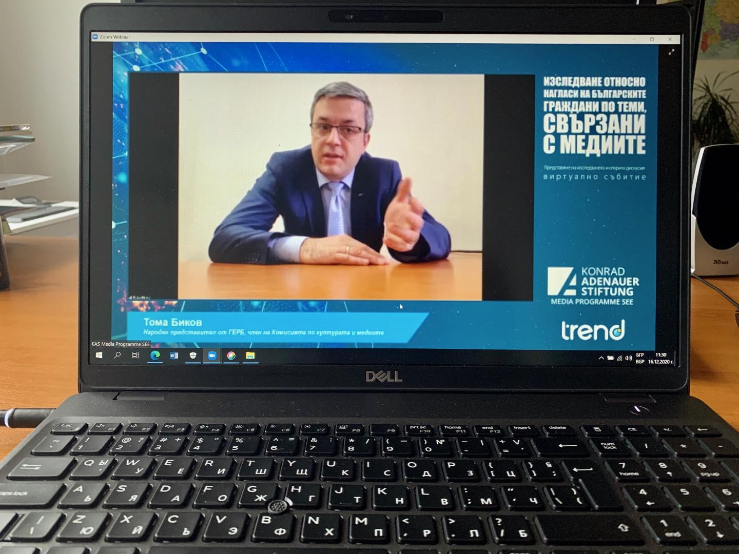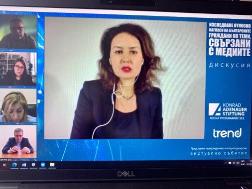 Die Ergebnisse wurden am 16. Dezember von Dr. Dimitar Ganev, „Trend”-Geschäftsführer, bei einer Online-Diskussion, die vom KAS Medienprogramm organisiert wurde, vorgestellt. Im Anschluss diskutierten Toma Bikov (GERB-Abgeordneter und Mitglied des Parlamentsausschusses für Kultur und Medien), Sofia Vladimirova (Mitglied des Rates für elektronische Medien), Stoyan Mihalev (DSB-Vorstandsmitglied) sowie Irina Nedeva (Vorsitzende der bulgarischen Sektion des Europäischen Journalistenverbandes) über die aktuelle Mediensituation in Bulgarien. Kristina Baxanova, Leiterin der Auslandsnachrichten-Abteilung des privaten Fernsehsenders bTV, moderierte die Veranstaltung.