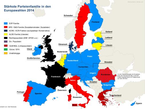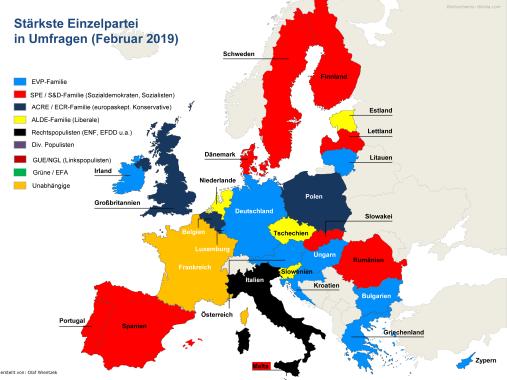 - Betrachtet man nicht die gesamte Parteienfamilie in einem Land, sondern nur die jeweils größte Einzelpartei, dann führt die EVP in 10 Ländern, die Sozialisten in 9, ALDE in 4 und ECR in 3, Rechtspopulisten und Unabhängige in je einem Land