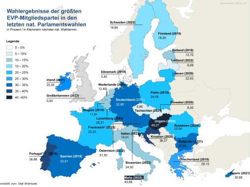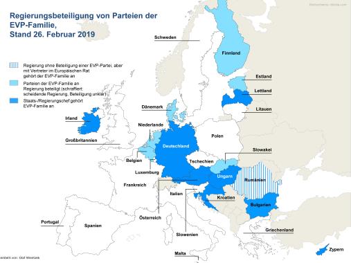 - Relativ stark (über 30%) in den Umfragen schneidet die EVP-Parteienfamilie in Deutschland, Rumänien, Ungarn, Portugal, Griechenland, Österreich, Bulgarien, Irland, Kroatien, Litauen, Slowenien, Malta und Zypern ab