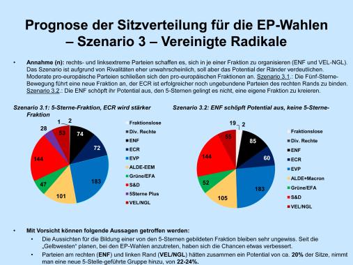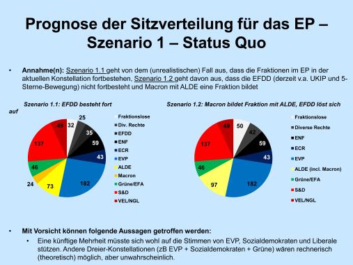 - Aufgrund mehrerer Unwägbarkeiten werden folgend drei verschiedene Szenarien für die Europawahlen durchgerechnet. Diese sind in Reinform wenig wahrscheinlich, deuten aber die jeweiligen Potentiale für die unterschiedlichen politischen Familien an.