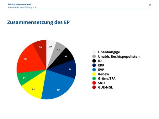 Die EVP-Familie ist in Umfragen in 10 Ländern die stärkste politische Familie (+2 im Vgl. zum letzten Barometer), die sozialistische in 7 (-1). Die liberale/Renew läge in 5, die euroskeptisch-nationalkonservative EKR in 2 (-1) Ländern vorn. Die Linke (GUE/NGL) führt in Irland, die rechtspopulistische ID in Österreich. In Ungarn lag die Fidesz vorne (noch nicht Teil einer Parteienfamilie) und in Litauen lagen formal unabhängige Parteien oder mehrere Parteienfamilien umfassende Bündnisse vorne.