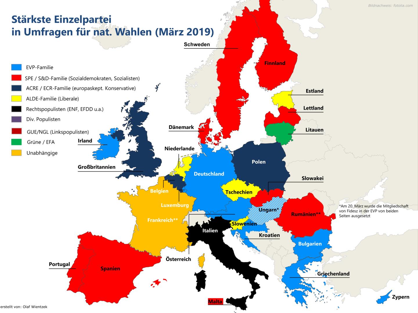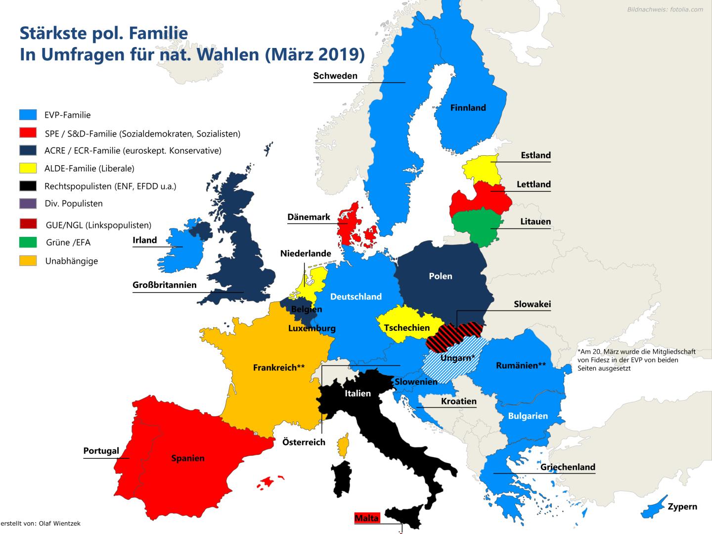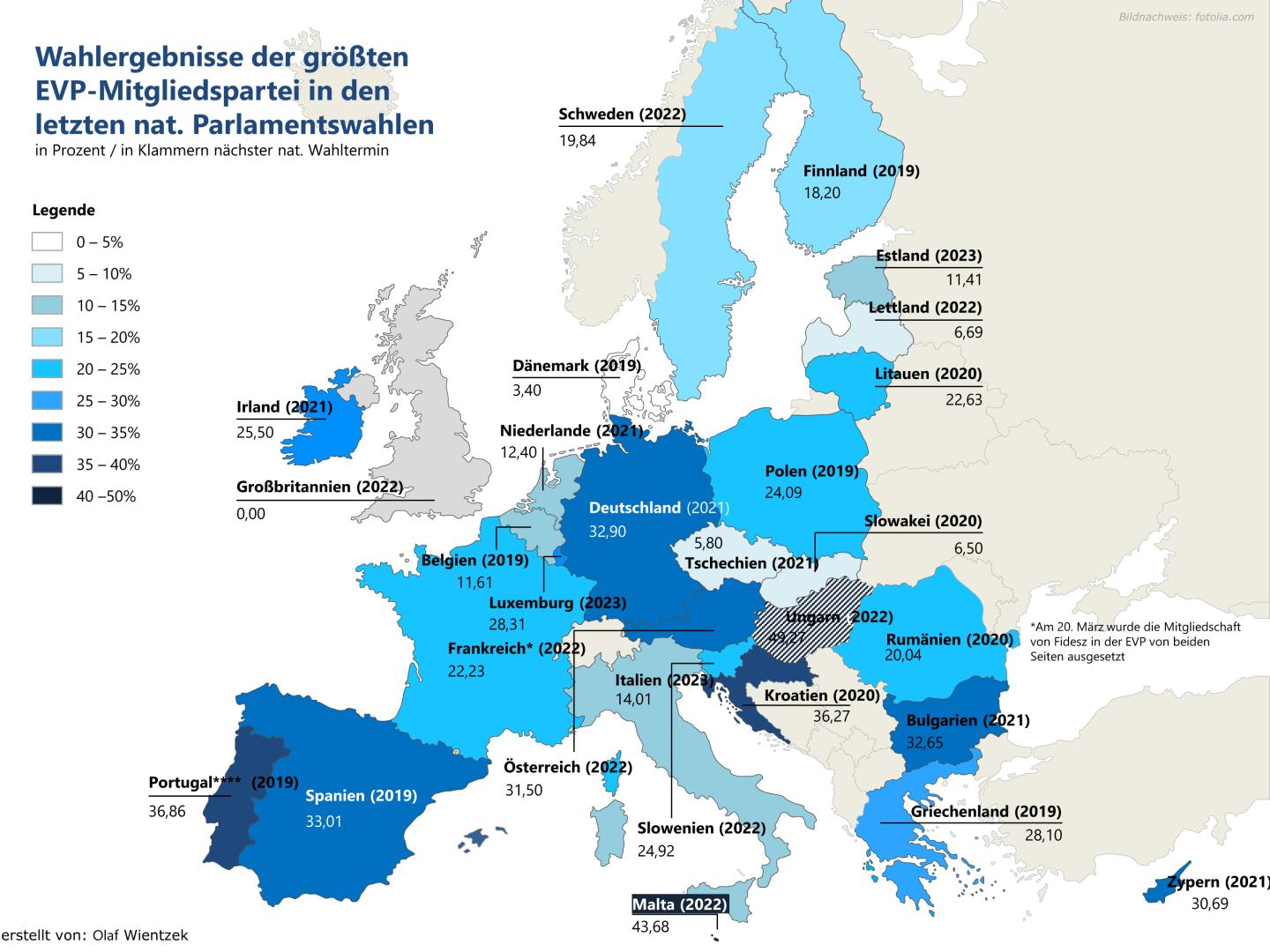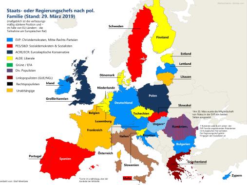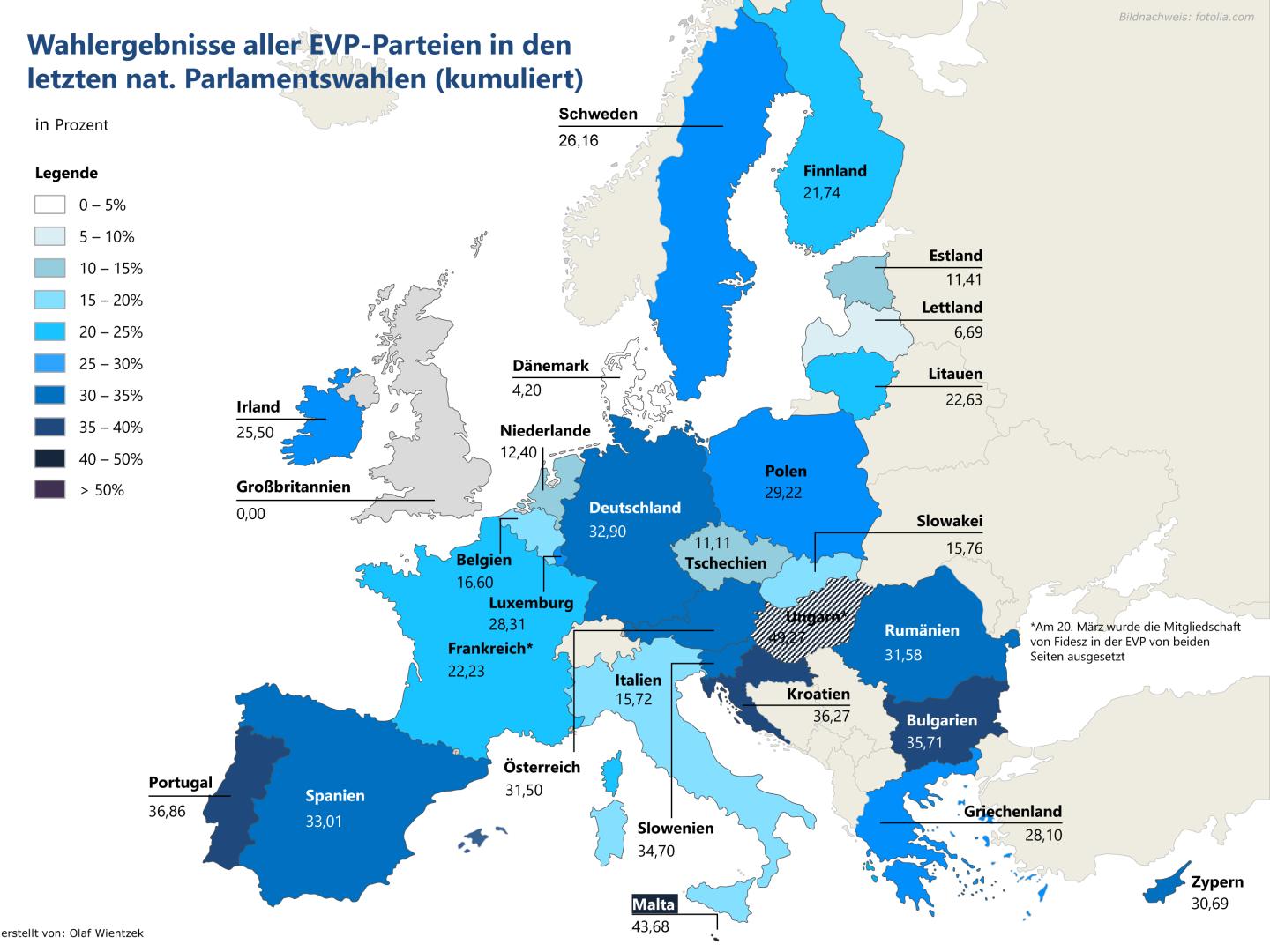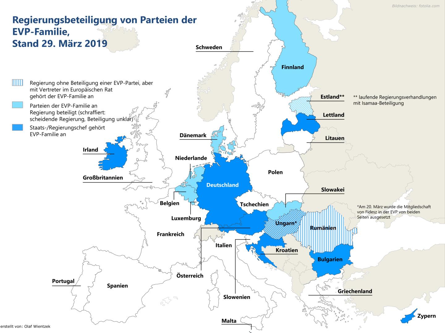 * Wenn die ungarische Fidesz, deren EVP-Mitgliedschaft bei der Vorstandssitzung vom 20. März mit den Stimmen beider Seiten ausgesetzt wurde, nicht berücksichtigt wird, ist die EVP in 12 Ländern stärkste Parteienfamilie und in 8 Ländern stärkste Einzelpartei. Ohne Viktor Orban würden noch 8 der 28 Staats- und Regierungschefs der EVP-Familie angehören.