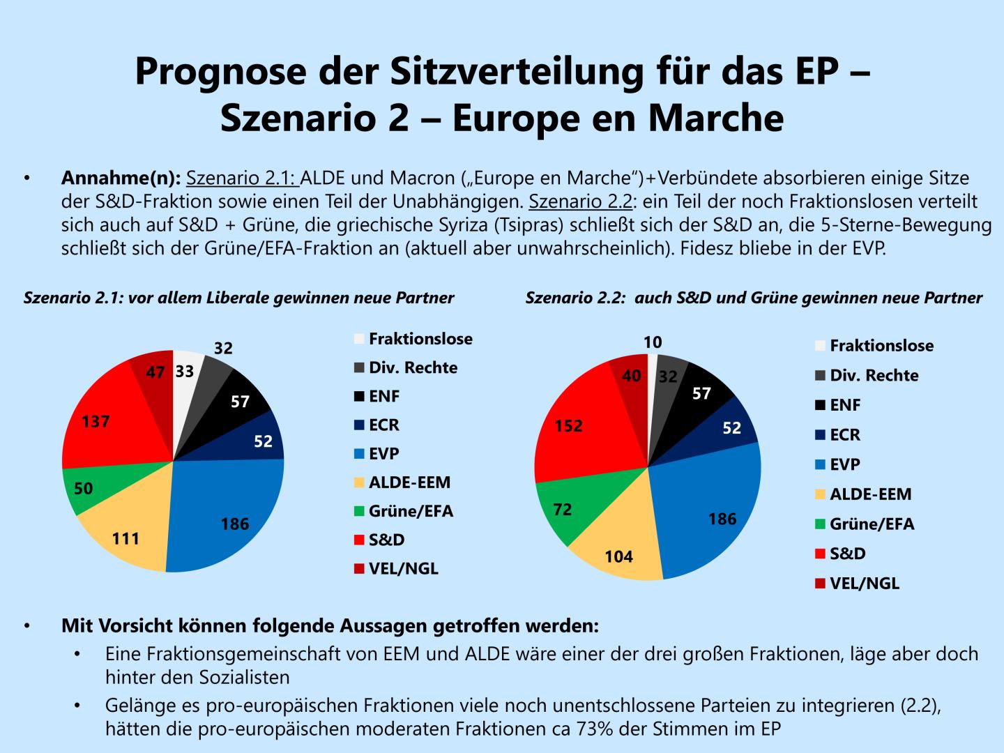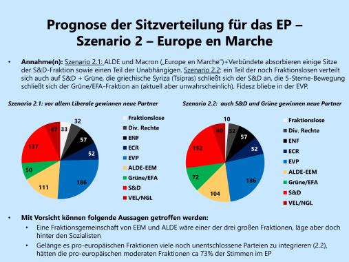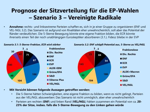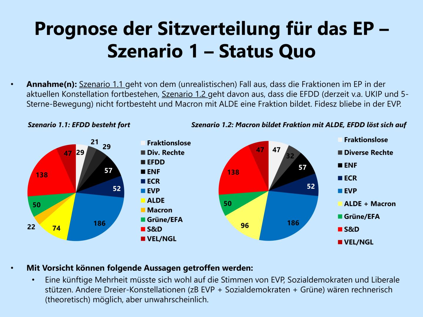 • 5-Sterne-geführte Fraktion: eher unwahrscheinlich, da mglw. nicht genug Länder vertreten für Fraktionsbildung. Potential bei 25-35 Sitzen, sollte UKIP/Brexit hinzustoßen, auch bei 40 Sitzen