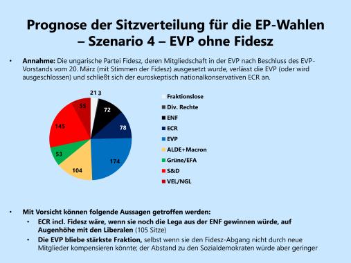 • Die EVP würde trotz Verlusten in den großen Ländern mit ca. 174-199 Sitzen stärkste Kraft im Europäischen Parlament bleiben (24,7%-28,2% der Sitze), ohne Fidesz mit 162-186 Sitzen