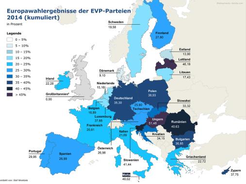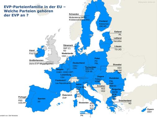 - Die Karten zeigen die Wahlergebnisse und Umfragewerte der Parteien in der EU, die der christdemokratischen-konservativ-bürgerlich geprägten Europäischen Volkspartei (EVP) angehören.