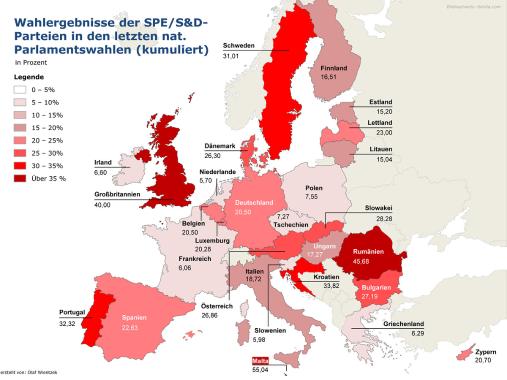- In sechs Ländern (Großbritannien, Rumänien, Malta, Portugal, Schweden, Kroatien) erzielten Parteien, die entweder der SPE (Sozialdemokratische Partei Europas) oder der S&D (Progressive Allianz der Sozialdemokraten)-Fraktion im EP angehören bei der letzten nationalen Parlamentswahl über 30%, in sechs weiteren Ländern (Polen, Tschechien, Niederlande, Frankreich, Griechenland, Irland) unter 10%.