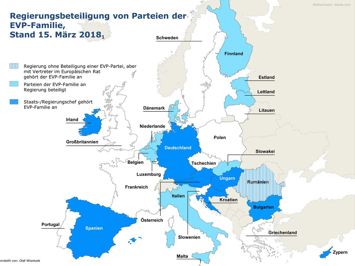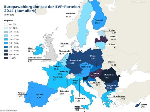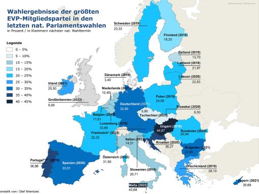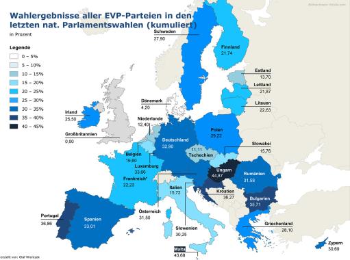 - Die Karten zeigen die Wahlergebnisse und Umfragewerte der Parteien in der EU, die der christdemokratischen-konservativ-bürgerlich geprägten Europäischen Volkspartei (EVP) angehören.
