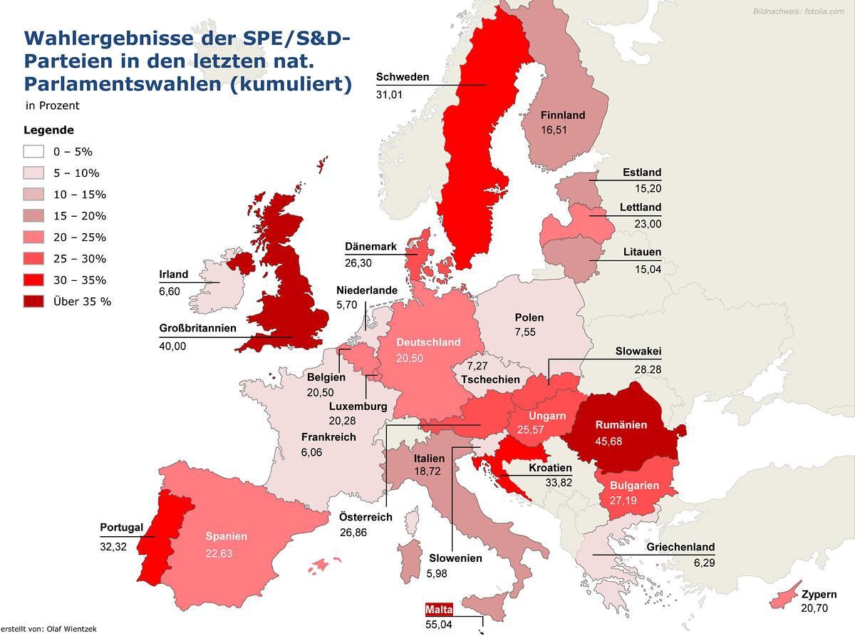 - In sechs Ländern (Großbritannien, Rumänien, Malta, Portugal, Schweden, Kroatien) erzielten Parteien, die entweder der der SPE (Sozialdemokratische Partei Europas) oder der S&D (Progressive Allianz der Sozialdemokraten)-Fraktion im EP angehören bei der letzten nationalen Parlamentswahl über 30%, in sechs weiteren Ländern (Polen, Tschechien, Niederlande, Frankreich, Griechenland, Irland) unter 10%.