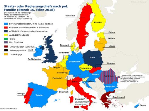- Im Europäischen Rat gehören 9 Staats- und Regierungschefs der EVP-Familie an, 8* den Liberalen, 5 den Sozialdemokraten/Sozialisten, 2 den euroskeptischen Konservativen, einer der Europäischen Linken, 3 sind unabhängig