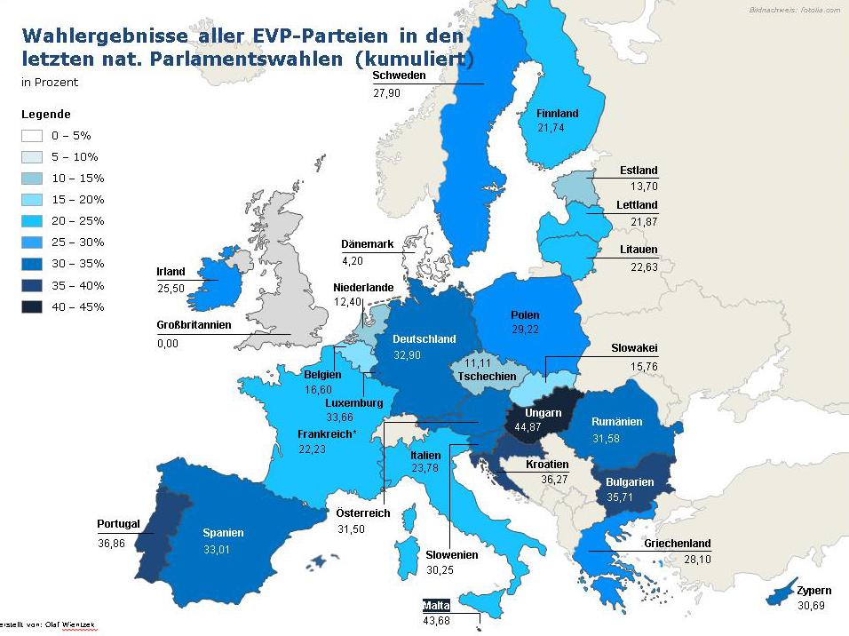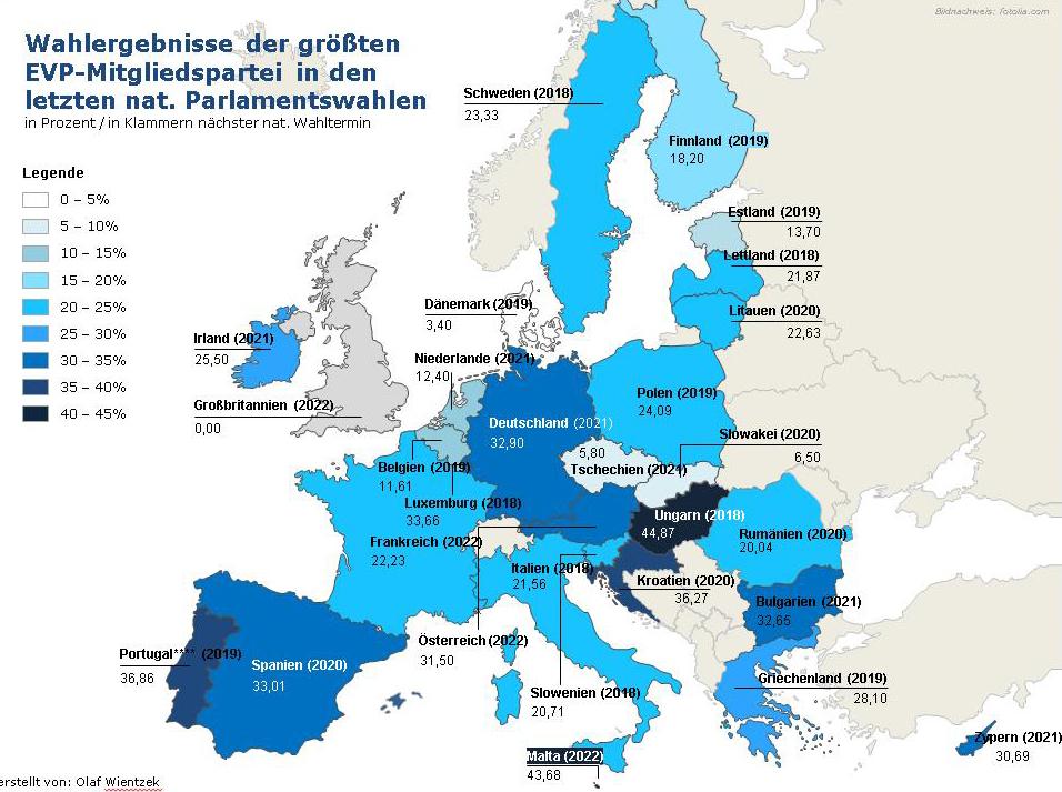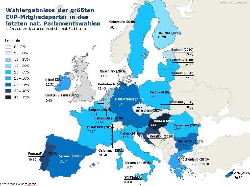 - Die Karten zeigen die Wahlergebnisse und Umfragewerte der Parteien in der EU, die der christdemokratischen-konservativ-bürgerlich geprägten Europäischen Volkspartei (EVP) angehören.