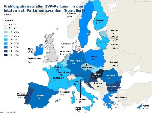 - Aktuell besonders starke Umfragewerte (über 30%) erzielt die jeweils größte EVP-Partnerpartei in Deutschland, Ungarn, Österreich, Kroatien, Bulgarien, Griechenland, Irland, Luxemburg, Malta und Zypern.