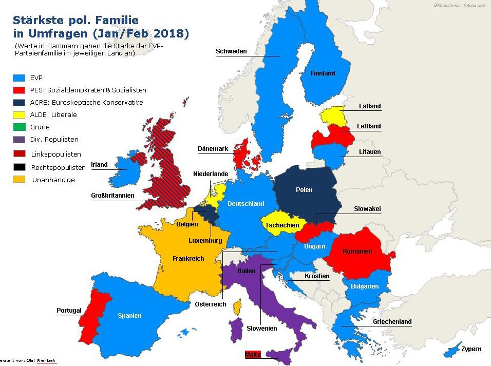 - Die EVP-Familie ist in Umfragen in 14 Ländern (+/- 0 im Vergleich zum letzten Barometer) die stärkste pol. Familie, die sozialistische in 6-7 (+1 bis +2), die eurokritisch-konservative ACRE in 2-3 (-1 bis -2), die liberale in 3 (+/-0), Unabhängige 1 (Macron bzw. LREM), Populisten 1 (5-Sterne in Italien). In einigen Ländern ist der Vorsprung vor anderen politischen Familien sehr knapp (Belgien, Schweden, Slowakei, Spanien) bzw. andere als die hier gewählten Umfrageinstitute sehen eine andere pol. Familie in Führung.