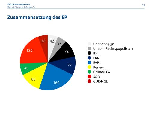Die EVP-Familie ist in Umfragen in 10 Ländern die stärkste politische Familie, die sozialistische in 6. Die liberale/ Renew liegt in 3, die euroskeptisch-nationalkonservative EKR und die ID (rechter Rand) in 2 Ländern vorn. Die Linke (GUE/NGL) führt in Irland. In Ungarn lag die Fidesz vorne (noch nicht Teil einer Parteienfamilie) und in Lettland und den Niederlanden lagen formal unabhängige Parteien vorne.