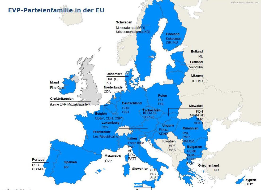 EVP-Parteienfamilie in der EU | Wahlergebnisse der größten EVP-Mitgliedspartei in den letzten nat. Parlamentswahlen | Stärkste politische Familiein Umfragen | Europawahlergebnisse der EVP-Parteien 2014 | Regierungsbeteiligung EVP-Parteien | Staats- oder Regierungschefs nach politischer Familie