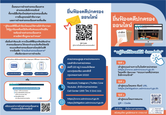 Das Office of the Administrative Court – mit Unterstützung der Konrad-Adenauer-Stiftung in Thailand – hat eine Broschüre erstellt, die die Nutzung des elektronischen Verwaltungsgerichtssystems, auch bekannt als e-Litigation Portal, erklärt. Ziel ist es, das Verständnis für das e-Litigation Portal für die allgemeine Öffentlichkeit und das interne Personal des OAC zu erhöhen. Die Hoffnung ist, dass Rechtsstreitigkeiten mehr gelöst werden.