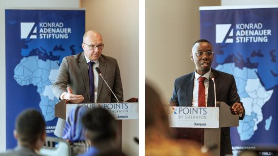 Das erste Panel, moderiert von Anisha Alinda, Programmmanagerin des KAS-Auslandsbüros Uganda und Südsudan, nahm eine Bestandsaufnahme der Lebensrealitäten urbaner Flüchtlinge in Uganda vor und betrachtete rechtliche Aspekte des Asyls, Herausforderungen im Bereich des städtischen Wohnraums, den Zugangs zu Dokumenten sowie die Teilnahme an informellen Ökonomien. Zu den Teilnehmenden zählten Muriel Iyanu, juristische Referentin des Law Development Centre, Eynas Latif, Projektmanagerin der Teeba Press, sowie Gerald Mulindwa und Innocent Ndahiriwe, beide Experten für Migration und Flüchtlingsmanagement. Die Teilnehmerinnen und Teilnehmer forderten die ugandische Regierung auf, die Anmeldung von Unternehmen und den Zugang zu rechtlichen Dokumenten für Flüchtlinge weiter zu erleichtern, um Selbstständigkeit, wirtschaftliche Teilhabe und Integration zu ermöglichen.