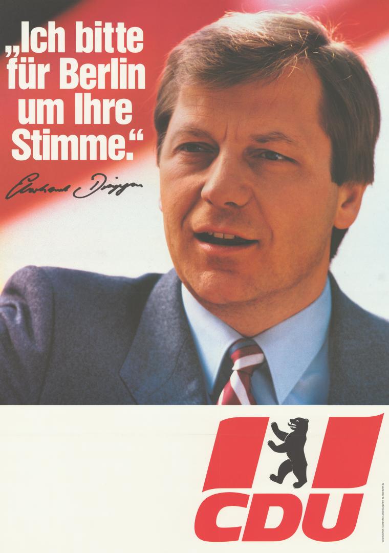 Nachfolger als CDU-Landesvorsitzender und Regierender Bürgermeister wurde der Vorsitzende der CDU-Fraktion im Abgeordnetenhaus, Eberhard Diepgen. Er bestimmte knapp zwei Jahrzehnte die Geschicke der CDU in Berlin. Steigende Arbeitslosenzahlen, das ungelöste Problem der Hausbesetzungen und Korruptionsskandale in Politik und Bauwirtschaft führten bei den Wahlen zum Abgeordnetenhaus vom 29. Januar 1989 jedoch zum Machtverlust. SPD und Alternative Liste verständigten sich unter der Führung von Walter Momper auf eine rot-grüne Regierung, die allerdings bereits im November 1990 am Streit über die Räumung besetzter Häuser in der Mainzer Straße auseinanderbrach Am 2. Dezember 1990 fanden deshalb parallel zu den ersten gesamtdeutschen Bundestagswahlen vorgezogene Neuwahlen zum Abgeordnetenhaus statt, in die die CDU als gemeinsamer Landesverband mit Diepgen als Spitzenkandidaten zog. Die Vereinigung der CDU aus beiden Teilen der Stadt hatte am 8. September 1990 stattgefunden. Auf diesem Parteitag war Eberhard Diepgen zum ersten Landesvorsitzenden der wiedervereinigten Berliner CDU gewählt worden.