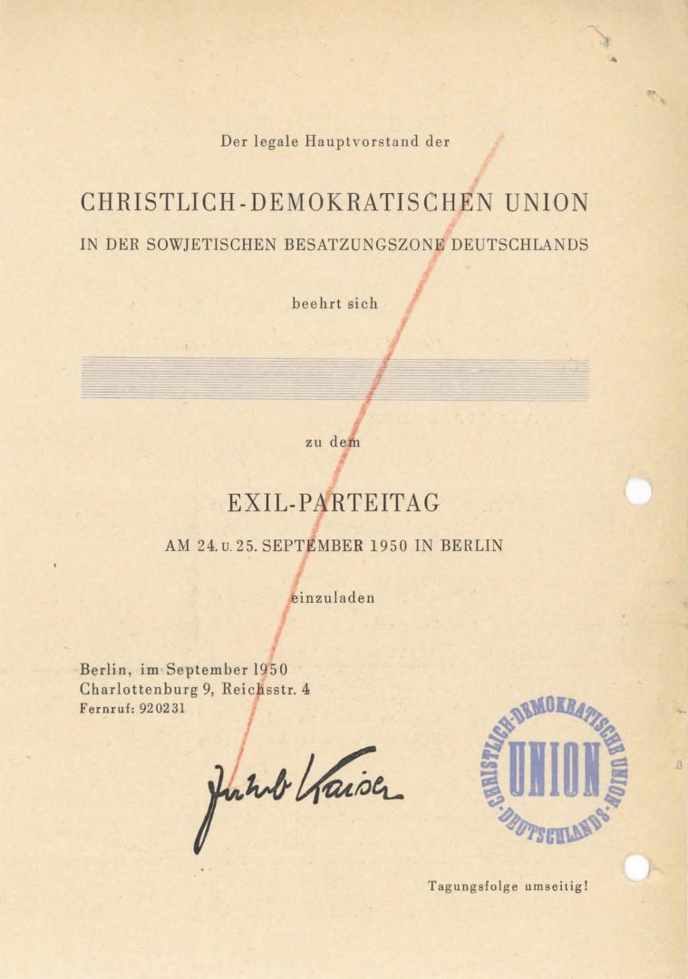 In Folge des Beschlusses zur Gründung der Bundespartei durch die Konferenz der Landesvorsitzenden der CDU im Mai 1950 konstituierten sich am 10. Juli 1950 die zu Jakob Kaiser stehenden zehn Mitglieder des vierzehnköpfigen Hauptvorstandes von 1947 neu und beriefen für den September des gleichen Jahres einen Exil-Parteitag nach Berlin ein. Dort wurde Kaiser als Vorsitzender bestätigt und ein Hauptvorstand gewählt, der für sich in Anspruch nahm, als einzige rechtmäßige Repräsentation der Christdemokraten in der DDR zu fungieren.