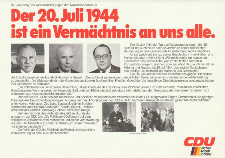 Überdies waren längst nicht alle, die am Widerstand beteiligt und in der Bundesrepublik politisch tätig waren, der Ansicht, dass das Erbe der NS-Gegner nach 1945 zu wenig Beachtung gefunden hatte. Im Gegenteil: Eugen Gerstenmaier etwa, der Präsident des Deutschen Bundestags von 1954 bis 1969, war ein entschiedener Befürworter von Adenauers Politik. Er äußerte sich in zahlreichen Reden und Schriften zu der Frage, in welcher Form das Erbe des Widerstands in der Bundesrepublik eine Rolle spielte. Zwei Aspekte hob er dabei besonders hervor: Zum einen hat er mehrfach betont, dass „die Überwindung des übersteigerten Nationalismus“ und „die Schaffung einer deutschen Verfassung im Rahmen eines europäischen Bundespakts“ ein Vermächtnis der Ideen des Kreisauer Kreises war. Damit ist nicht gesagt, dass Konrad Adenauers Politik der europäischen Integration direkt auf den Plänen des Widerstands aufbaute – tatsächlich ist überhaupt nicht bekannt, ob Adenauer unmittelbar nach dem Krieg überhaupt Kenntnis von den Europaplänen hatte, die in den Widerstandsbewegungen während des Zweiten Weltkriegs in Deutschland aber auch in zahlreichen Ländern im europäischen Ausland von verschiedenen politischen Gruppierungen entwickelt worden waren. Es kann jedoch kein Zweifel daran bestehen, dass die Pläne zur wirtschaftlichen und politischen Verflechtung der Bundesrepublik, die Adenauer zusammen mit seinen Partnern aus Frankreich und Italien Robert Schuman und Alcide De Gasperi realisierte, mit der grundsätzlichen Zielsetzung vieler Gegner des NS-Regimes übereinstimmte. Daneben war, wenn es um das Erbe des Widerstands ging, für Gerstenmaier ein weiterer Aspekt essenziell: „Die Wiederherstellung des freiheitlichen Rechtsstaates und seiner entschlossenen Verteidigung gegen seine inneren und äußeren Feinde“ sei das Vermächtnis des 20. Juli 1944. Dies äußerte er beispielsweise bei seiner Rede zum 40. Jahrestag des Attentats in der Berliner Kongresshalle im Juli 1979. „Der deutsche Widerstand hat von Anfang bis zu Ende immer nur an das ganze Deutschland gedacht. Deshalb gehört zu seinem Vermächtnis auch die uneingeschränkte Pflicht, den einen freiheitlichen Rechtsstaat für alle Deutschen zu verfechten.“ Hierin liege auch „der Sinnzusammenhang zwischen dem 20. Juli und dem 17. Juni“, also dem Tag des Volksaufstands gegen Bevormundung und Repression in der DDR. Auch diese gedankliche Brücke, die Gerstenmaier errichtete, entsprach unbedingt den Grundsätzen von Adenauers Politik und der Politik der CDU bis zur Beendigung der deutschen Teilung 1990, denn sie zielte stets auf den Erhalt und die Erlangung von Freiheitsrechten für alle Deutschen.