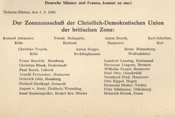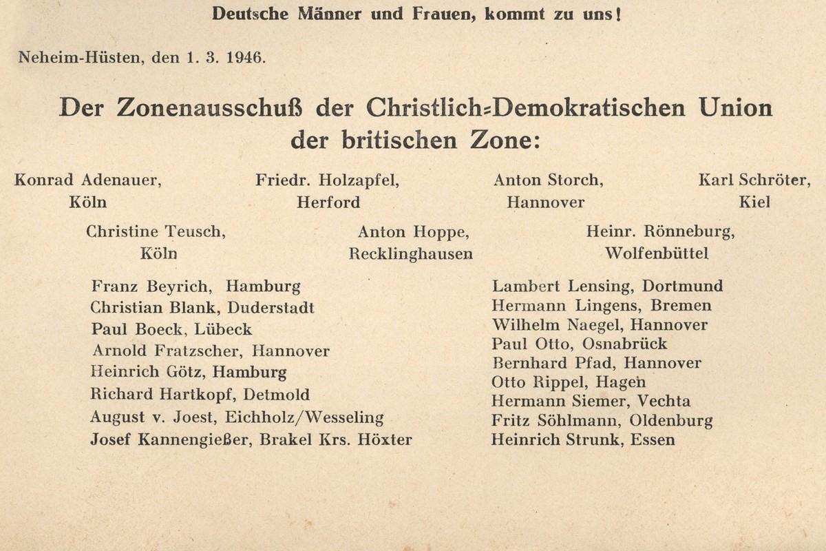 Nicht nur um ihre programmatische Weiterentwicklung stritt die CDU in der britischen Zone auf ihrer Tagung in Neheim-Hüsten. Auf dieser zweiten Sitzung des Zonenbeirates wurde auch die Frage des Vorsitzes geklärt.