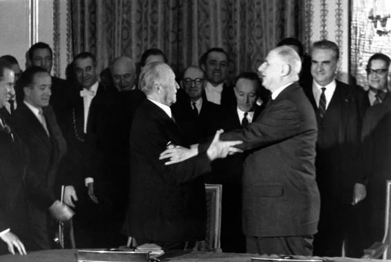 Am 22. Januar 1963 unterzeichneten Charles de Gaulle und Konrad Adenauer in Paris den Vertrag über die deutsch-französische Zusammenarbeit. Dieser Freundschaftsvertrag, der ursprünglich nur die Form einer Vereinbarung haben sollte, setzte sich zum Ziel, das Ende der "Erbfeindschaft" zwischen Deutschland und Frankreich zu besiegeln.