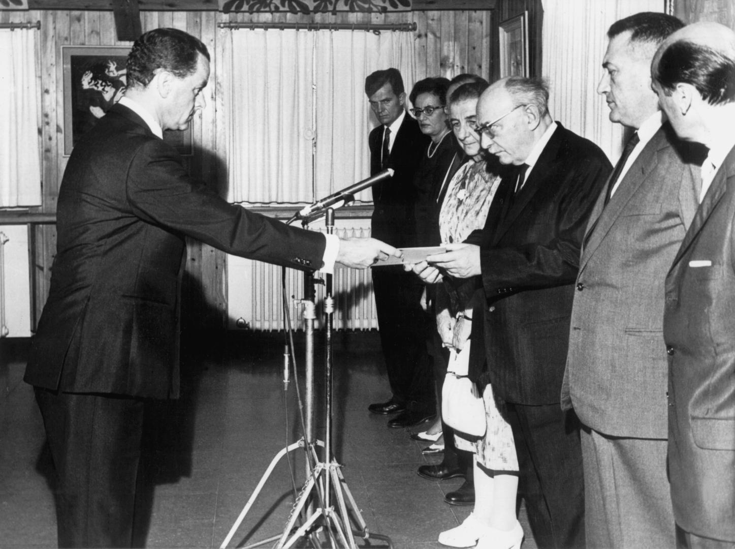 Nachdem zunächst der Abgeordnete Kurt Birrenbach als Sonderemissär nach Tel Aviv gesandt wird, um dort über die Ablösung der Waffenlieferungen zu verhandeln, setzen sich einflussreiche Christliche Demokraten wie Heinrich Krone, Josef Hermann Dufhues und Eugen Gerstenmaier bei Erhard intensiv für eine sofortige Aufnahme von diplomatischen Beziehungen zu Israel ein. Insbesondere der gerade aus den USA zurückgekehrte Fraktionsvorsitzende von CDU und CSU im Deutschen Bundestag, Rainer Barzel, tut sich dabei hervor. Neben offiziellen Besuchen bei US-Präsident Johnson und Außenminister Dean Rusk hatte er in New York vertrauliche Unterredungen mit hochrangigen Vertretern jüdischer Verbände sowie Israels Botschafter Avraham Harman. Dabei war er zur Überzeugung gelangt, dass im westlichen Interesse die Beziehungen zu Ägypten zwar nicht von bundesrepublikanischer Seite abgebrochen werden sollten, diejenigen zu Israel jedoch in jedem Fall aufgenommen werden müssten. In mehreren eindringlichen Gesprächen macht Barzel sich beim Kanzler für diese Linie stark, wirft sein ganzes Gewicht als Fraktionsvorsitzender in die Waagschale. Bei Erhard rennt er damit offene Türen ein, dieser entscheidet nun rasch und macht offensiv von seiner Richtlinienkompetenz Gebrauch: Ohne das Kabinett oder gar Außenminister Schröder im Vorfeld zu informieren, lässt er Regierungssprecher Hase am Sonntag, den 7. März 1965 die Absicht der Bundesregierung verkünden, mit Israel in sofortige Verhandlungen zur Aufnahme diplomatischer Beziehungen zu treten. Die Entscheidung fällt so schnell, dass der noch mit anderen Instruktionen angereiste Birrenbach in Tel Aviv von den Israelis über die neue Lage informiert wird. Offiziell werden die Beziehungen am 12. Mai 1965 aufgenommen.