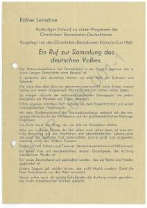 Am 1. Juli 1945 wurden die Programmberatungen abgeschlossen und ein 20 Punkte umfassender „Vorläufiger Entwurf zu einem Programm der Christlichen Demokraten Deutschlands“ verabschiedet. Unter dem Eindruck des gerade erst überwundenen Nationalsozialismus rief es die Deutschen dazu auf, sich zu sammeln und ein „neues und schöneres Deutschland aufzubauen auf dem unerschütterlichen Fundament des Christentums und der abendländischen Kultur“.