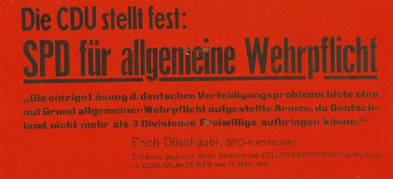 Der sich verschärfende Kalte Krieg und der Ausbruch des Korea-Krieges 1950, der als Bedrohung Westeuropas aufgenommen wurde, gaben den Gedanken um einen deutschen Verteidigungsbeitrag (nicht zuletzt auch im Zusammenhang mit den Bemühungen um die staatliche Souveränität) Auftrieb. Diese Gedanken führten in den nächsten Jahren zu heftigsten innenpolitischen Diskussionen, nicht zuletzt vor dem Hintergrund des Zweiten Weltkrieges und der Erfahrungen der nationalsozialistischen Gewaltherrschaft. Auch innerhalb der CDU gab es Bedenken, wie es beispielsweise Eugen Gerstenmaier in der Debatte um das Wehrergänzungsgesetz kundtat.