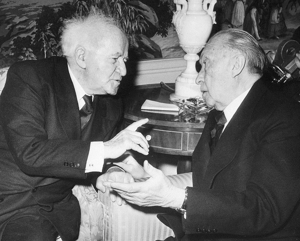 „Er ist der Ältere“. Mit diesen Worten schob der israelische Premierminister David Ben-Gurion am 14. März 1960 die Bedenken seiner Protokollbeamten beiseite und begab sich aus seiner Suite im 37. Stock des New Yorker Edelhotels Waldorf Astoria in den 35. Stock zur Präsidentensuite, in der sein deutscher Amtskollege, der deutsche Bundeskanzler, Konrad Adenauer, residierte. Ben-Gurion musste die Feuerleiter benutzen, weil Scharen neugieriger Pressefotografen die Flure und Aufzüge des Hotels so belagerten, dass kein Durchkommen mehr möglich war.