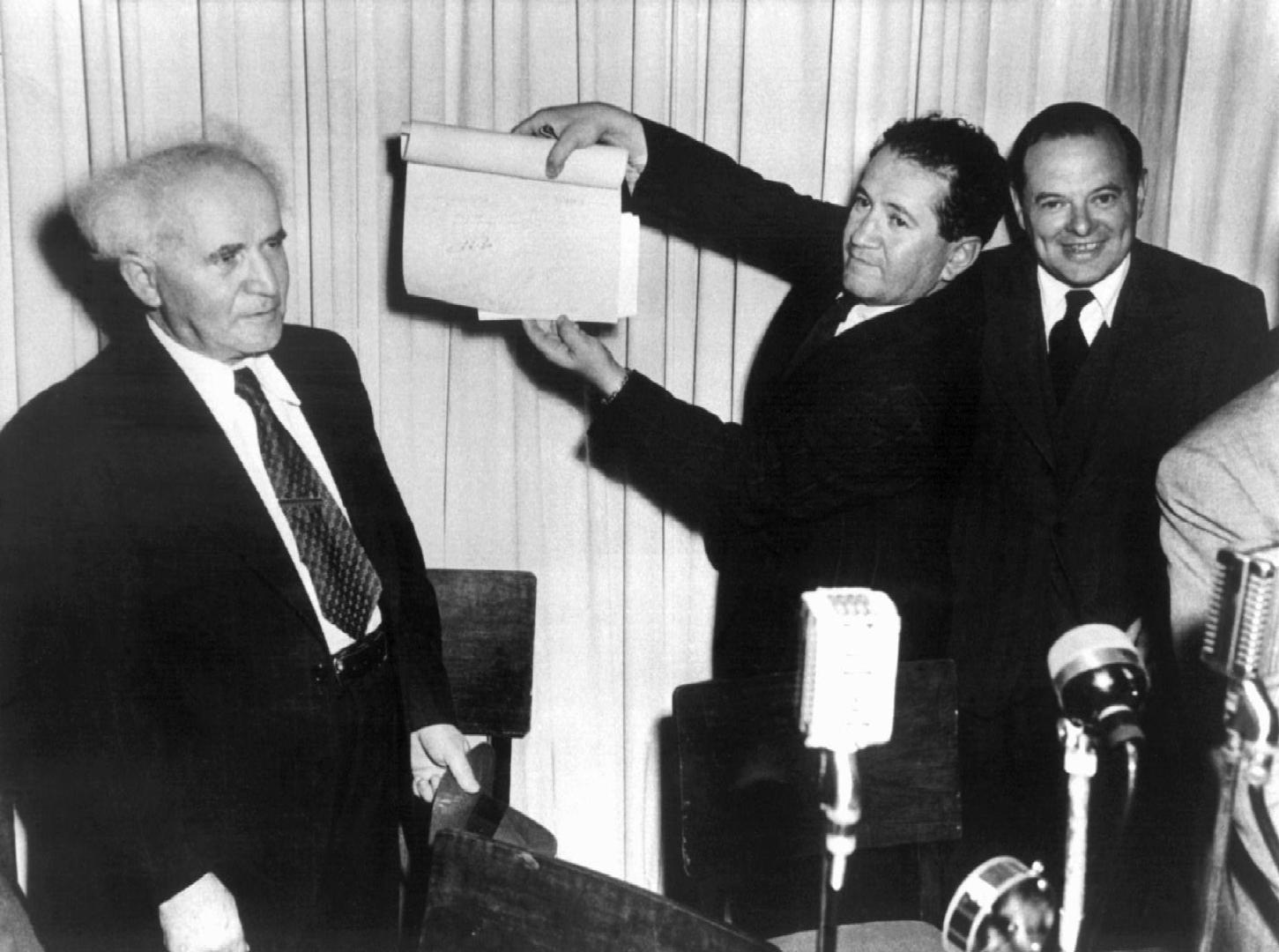 Der Jubel auf den Straßen war groß, aber die Feierlichkeiten zum Gründungsakt des Staates Israel waren eher bescheiden und vor allem zeitlich knapp gehalten. Der Gründervater Israels, David Ben Gurion, wollte am 14. Mai 1948 im Dizengoff-Museum in Tel Aviv bewusst wenig Aufsehen erregen. Zu groß war die Angst, dass die britische Mandatsmacht doch noch in letzter Minute einschreiten und den historischen Akt verhindern könnte, aber niemand hindert ihn daran, die Unabhängigkeitserklärung vor 150 geladenen Gästen zu verlesen. Und dies unter dem Konterfei von Theodor Herzl, jenes Mannes, der den Traum einer jüdischen Heimstatt an historischer Stelle rund fünf Jahrzehnte zuvor ersehnt und mit seinen Schriften vorbereitet hatte. In etwas mehr als 30 Minuten wurde aus dem vormaligen britischen Mandatsgebiet der Staat Israel. Noch vor Mitternacht erkannte der amerikanische Präsident Harry S. Truman den neuen Staat an, die Sowjetunion folgte kurze Zeit später.