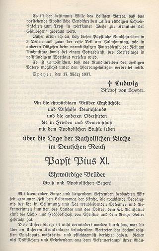 Die Reichsregierung reagierte sogleich mit einem Schnellbrief vom 23. März 1937 an alle deutschen Bischöfe. Darin wurde ihnen „eine schwere Verletzung der im Reichskonkordat festgesetzten Vereinbarungen“ vorgeworfen und „Druck, Vervielfältigung und Vertreibung des Rundschreibens in jeder Form verboten“. In seinem Antwortschreiben vom 26. März wies der Vorsitzende der Fuldaer Bischofskonferenz, Kardinal Bertram, den Vorwurf „mit aller Entschiedenheit“ zurück.