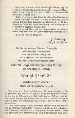 Die Enzyklika "Mit brennender Sorge" wird am Palmsonntag von allen Kanzeln der katholischen Kirche in Deutschland verlesen