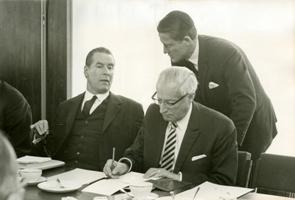 Gerhard Schröder (links), Vorsitzender 1955-1978, hier gemeinsam mit Walter Strauß (rechts) am 28. April 1967. (Quelle: Konrad-Adenauer-Stiftung, ACDP.)