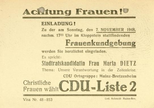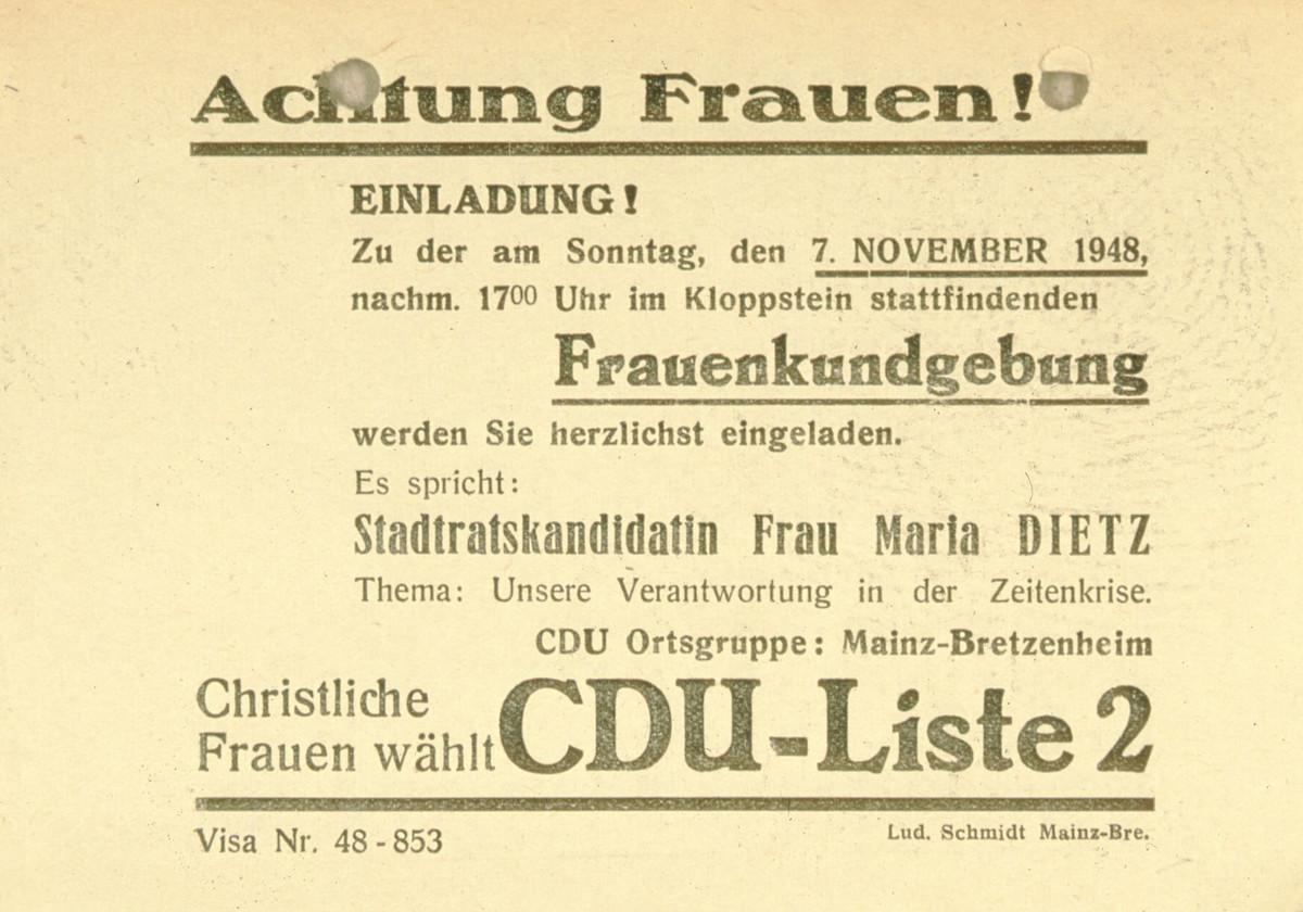 „Die politische Bildungsarbeit beginnt für die Frau innerhalb der Familie, weil dieser intimste Kulturkreis schon die Jugendlichen erfassen kann und mit einer Selbstverständlichkeit in eine bestimmte politische Atmosphäre hineinführt. Auch die Schulen verschiedenster Art können viel dazu beitragen, dass das staatsbürgerliche Interesse geweckt wird. Aber die eigentlich vertiefte politische Bildung beginnt doch erst später. Wir werden mit besonderem Erfolg an ihr arbeiten, wenn die Frauenorganisationen, die auf der weltanschaulichen Grundlage der CDU stehen, durch staatsbürgerliche Bildung und Erziehung die Frauen in größeren oder kleineren Gruppen erfassen. Unsere parteipolitische Bildungsarbeit ist konkreter, vertiefter. Sie erfasst nicht nur die grundsätzlichen, sondern auch die einzelnen Probleme der Wirtschafts- und Ernährungspolitik, der Staatspolitik. Sie muss in die großen Entscheidungen der Aussenpolitik einführen und den Blick öffnen für die grossen Zusammenhänge in Europa und in der ganzen Welt. Sie wird die sozialen und die sozialpolitischen Fragen erörtern und zur Debatte stellen. Auch die kulturpolitischen Fragen des Bundes und der Länder müssen auf grundsätzlicher Basis die Notwendigkeiten der Zeit diskutieren. (…) Durch diese Zielsetzung kann das Mitteilungsblatt über den Rahmen eines Nachrichtendienstes hinaus wachsen. Systematik und eine Fülle von Gedanken sind notwendig, denn politische Bildung auf christlicher Grundlage verlangt Weite, Reichtum, Fülle.“