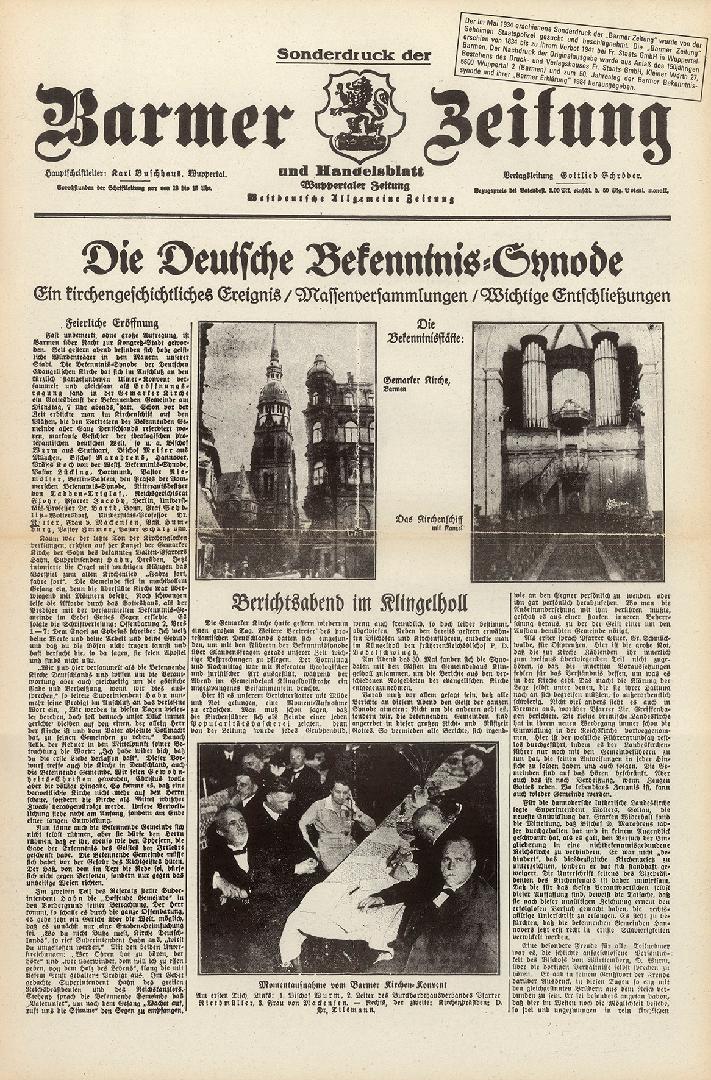 Erste Bekenntnissynode der Deutschen Evangelischen Kirche in Barmen im Mai 1934
