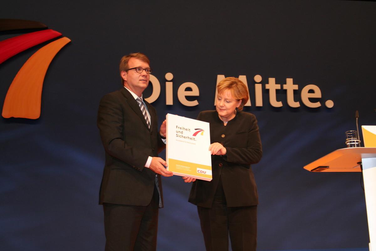 „Neues Denken heißt für uns: Freiheit und Sicherheit gehören zusammen. Nach unserem Verständnis ist Freiheit ohne Sicherheit nicht denkbar, aber Sicherheit ohne Freiheit auch nicht. Wir haben bei den Beratungen zum Grundsatzprogramm Wert daraufgelegt, dass die Architektur der CDU aus Freiheit und Sicherheit besteht. Beides gehört untrennbar zusammen.“
