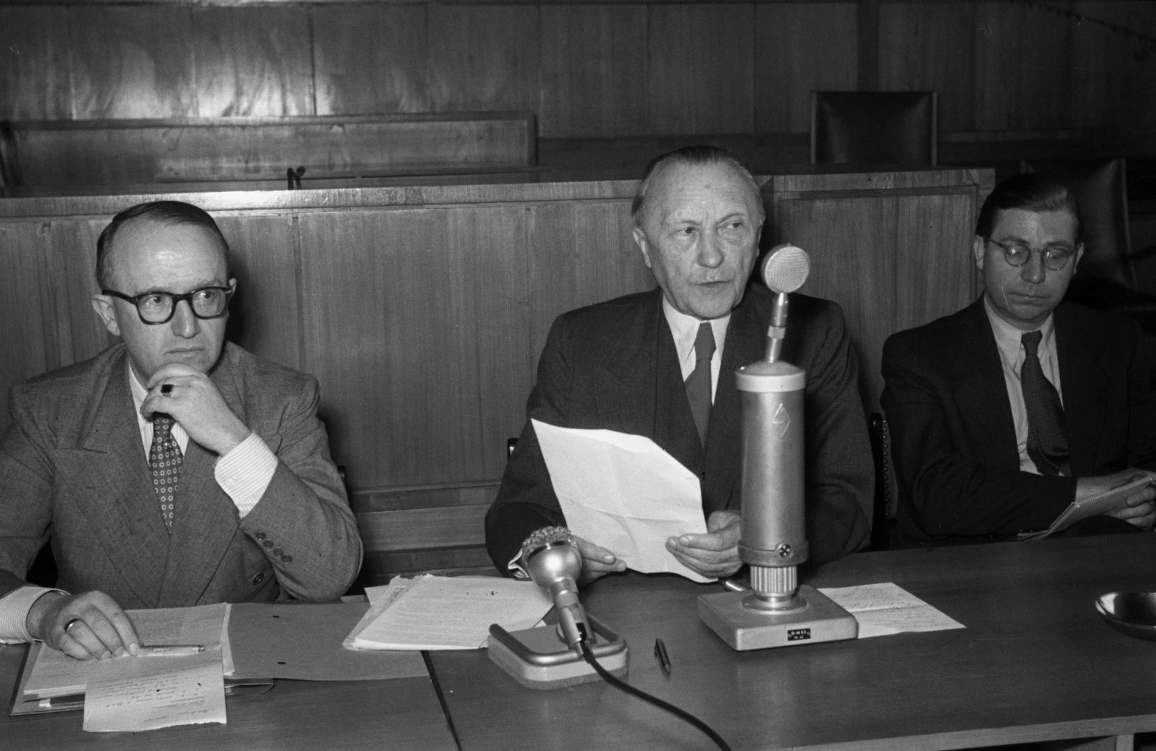 Für die Konstituierung einer Republik in Deutschland lagen im Frühjahr 1949 zwei Verfassungsentwürfe vor. Am 23. Mai verkündete der in Bonn zusammengetretene Parlamentarische Rat das Grundgesetz für die Bundesrepublik Deutschland. In der folgenden Woche, am 29./30. Mai, nahm der in Ost-Berlin tagende Dritte Deutsche Volkskongress den Verfassungsentwurf einer deutschen demokratischen Republik an. Nach dem neuerlichen Fehlschlag der Viermächte-Konferenz in Paris, auf der sich der Rat der Außenminister lediglich über einen Modus vivendi zur Beendigung der Berlin-Blockade verständigte, gingen die Westmächte mit der Gründung der Bundesrepublik weiter voran.