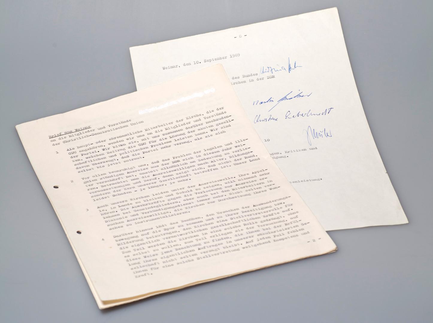 Am 10. September 1989 unterzeichneten vier CDU-Mitglieder in Weimar einen offenen Brief an die Mitglieder und Vorstände der CDU der DDR. Diese vier Personen stammten alle aus dem Gebiet, das bis 1952 das Land Thüringen gebildet hatte, und waren in Gremien des Bundes der Evangelischen Kirchen in der DDR (BEK) engagiert. Initiator und führender Kopf der Aktion war Kirchenrat Dr. Gottfried Müller aus Jena. Weiterhin beteiligt waren die Rechtsanwältin Martina Huhn, Mitglied der Bundessynode, Martin Kirchner, Oberkirchenrat aus Eisenach, und Christine Lieberknecht, Pastorin aus Ramsla bei Weimar.