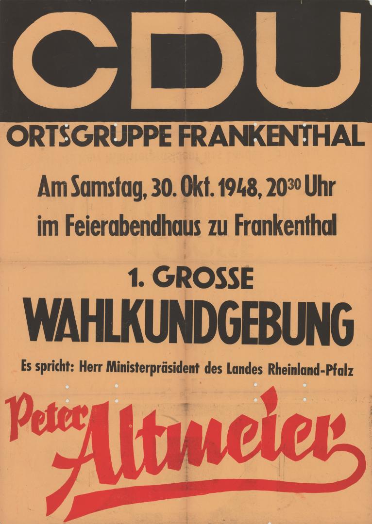 Schließlich wurde am 14. Februar 1947 auf einer Tagung in Bad Kreuznach der Zusammenschluss zur Landespartei bestätigt und der Landesverband der CDU offiziell konstituiert. Gleichzeitig wurde mit der Wahl Altmeiers zum Vorsitzenden die zukünftige Richtung der Partei festgelegt. Er stand nahezu 20 Jahre lang an der Spitze der CDU Rheinland-Pfalz. Die beiden reformfreudigen Repräsentanten der neu gegründeten Partei, Altmeier und Süsterhenn – letzterer hatte auch an der Entstehung der Landesverfassungs maßgeblichen Anteil – strebten für den politischen Neubeginn eine geistige Erneuerung des Staats- und Rechtsdenkens an. Diese Maxime wurde so in die Landesverfassung übertragen, die deshalb, wie kaum eine andere moderne Verfassung, von christlich-naturrechtlichem Denken und Subsidiarität bestimmt ist.