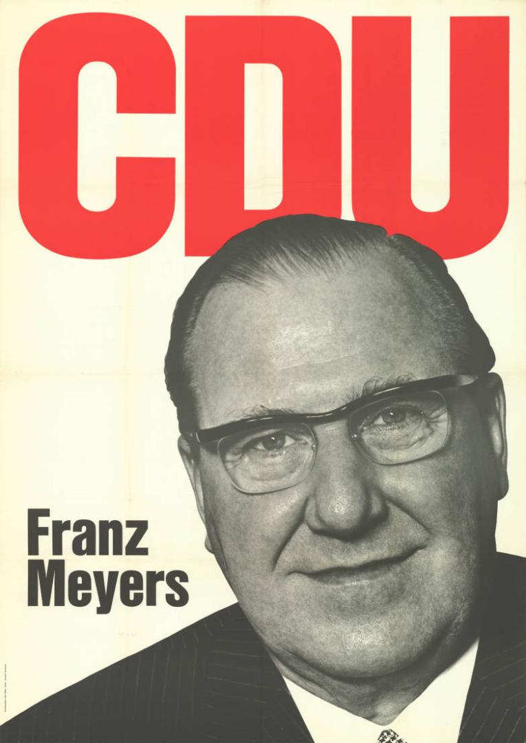Im Sog der Bundestagswahl von 1957 erreicht die CDU bei der Landtagswahl am 6. Juli 1958 die absolute Mehrheit. Mit einem Stimmenanteil von 50,5 Prozent erzielt sie ihr bis heute bestes Ergebnis in der Geschichte nordrhein-westfälischer Landtagswahlen. In die Staatskanzlei kehrt allerdings nicht Karl Arnold zurück, der eine Woche vor der Wahlentscheidung verstorben ist. In der CDU-Landtagsfraktion setzt sich bei der Kür des Kandidaten für das Amt des Ministerpräsidenten der frühere Innenminister Franz Meyers, der 1957 Adenauers erfolgreichen Bundestagswahlkampf organisiert hat, deutlich gegen die beiden Landesparteivorsitzenden Wilhelm Johnen und Josef Hermann Dufhues sowie den Landtagspräsidenten Josef Gockeln durch. Die Wahl von Meyers zum neuen Ministerpräsidenten erfolgt am 21. Juli 1958. Zunächst steht er einer Alleinregierung der CDU vor. Nach der Landtagswahl von 1962, bei der die CDU ihre absolute Mehrheit verliert, aber die stärkste politische Kraft bleibt, führt er eine Regierungskoalition von CDU und FDP an.