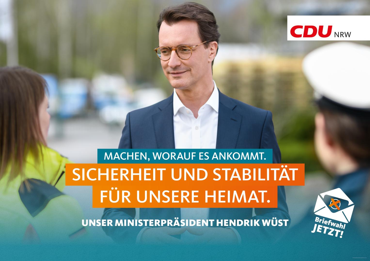 Die CDU stellt Wüst als ihren Spitzenkandidaten in das Zentrum der Wahlkampagne, die unter dem Slogan „Machen, worauf es ankommt“ steht. Der Slogan bezieht sich zum einen auf die erfolgreiche Arbeit der CDU-geführten Landesregierung in den vergangenen fünf Jahren, zum anderen präsentiert sich Wüst als frische Kraft mit einem Zukunftsprogramm für die 2020er-Jahre.