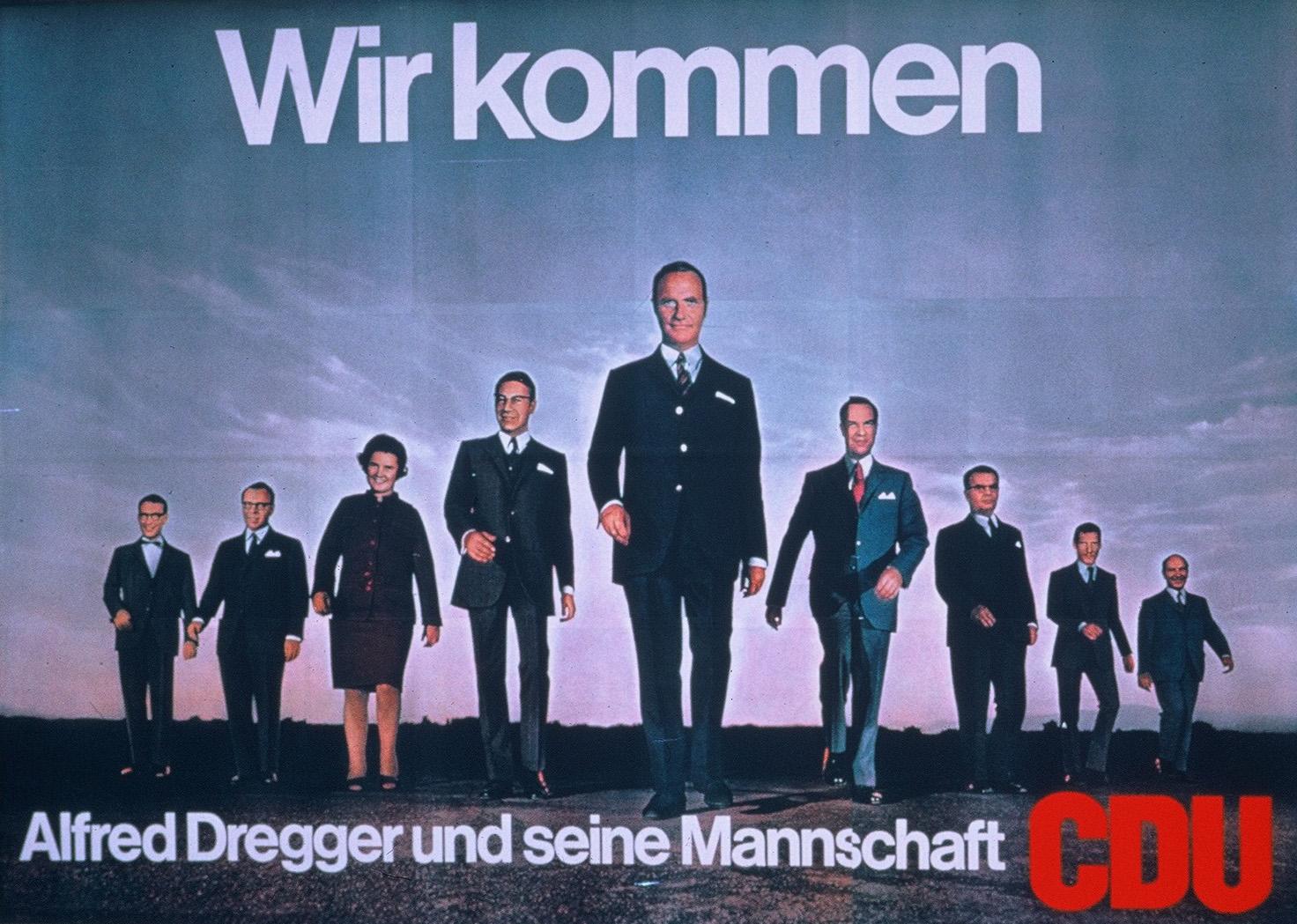 Sollte es eine Herzkammer der SPD in einem deutschen Flächenland je gegeben haben, so lag sie weniger in Nordrhein-Westfalen denn in Hessen, wo die Sozialdemokraten seit 1946 für Jahrzehnte den Regierungschef stellten. Bei den Landtagswahlen 1966 erreichte die SPD 51% der Stimmen und war damit fast doppelt so stark wie die CDU (26,4%). In dieser Situation wurde Dregger auf einem legendären Parteitag in Eltville 1967 zum Landesvorsitzen gewählt. Zu dem jungen neuen Führungsteam gehörten weitere später bekannte Persönlichkeiten wie Christian Schwarz-Schilling, Walter Wallmann und Heinz Riesenhuber. Der „Geist von Eltville“ sorgte für Aufbruchstimmung, wofür symbolisch das Wahlplakat zur Landtagswahl 1970 unter dem Slogan „Wir kommen“ stand, „auf dem Dregger an der Spitze seiner in Keilform angetretenen Mannschaft der Sonne entgegenzumarschieren scheint“ (Dieter Weirich). Das an populäre Westernfilme angelehnte Motiv brachte Dregger den Spitznamen „Django“ ein. Im Ergebnis konnte die CDU ihr Ergebnis signifikant auf 39,7% verbessern, die SPD verlor mit 45,9% die absolute Mehrheit. Auch bei den drei nachfolgenden Wahlen fuhr die CDU unter ihrem Spitzenkandidaten Dregger sehr gute Ergebnisse ein. 1974 wurde sie mit 47,3% erstmals stärkste Kraft, ebenso 1978 mit 46% und 1982 mit 45,6%.