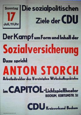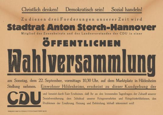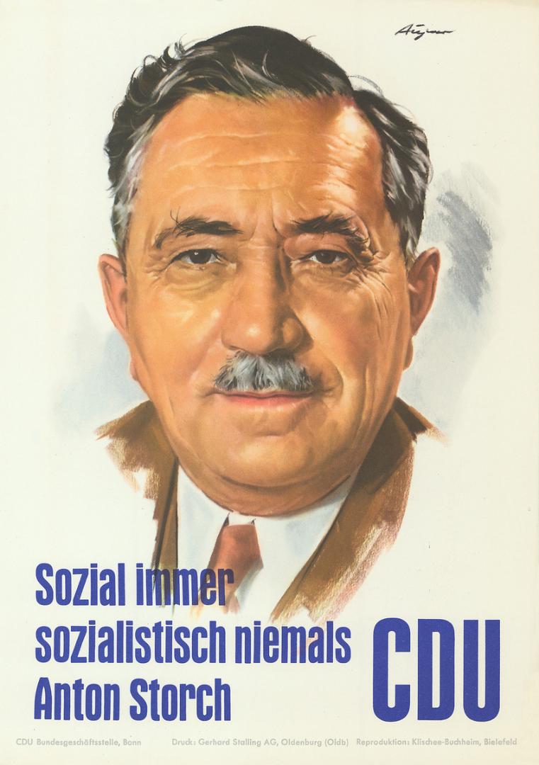 Bei der Wahl zum 1. Deutschen Bundestag im August 1949 wurde Anton Storch, der als guter Redner bekannt war, als Kandidat des Wahlkreises Osnabrück-Stadt und -Land gewählt. Bis zu seinem Ausscheiden aus dem Bundestag 1965 konnte er den Wahlkreis verteidigen.