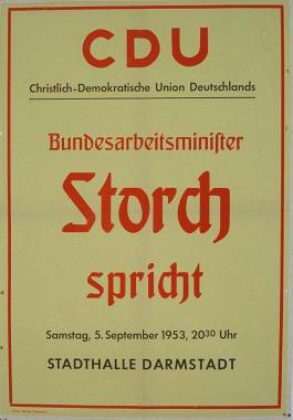 Nach anfänglichem Zögern holte Bundeskanzler Konrad Adenauer den früheren Direktor der Verwaltung für Arbeit und profilierten Arbeitervertreter Storch als Bundesminister für Arbeit in sein Kabinett. Am 20. September 1949 wurde Storch in Bonn vereidigt. Seine Wahl erfolgte wiederum gegen den Widerstand der Koalitionsparteien FDP und DP, die zum Ausgleich auf die Ernennung eines arbeitgeberfreundlichen Staatssekretärs drängten.