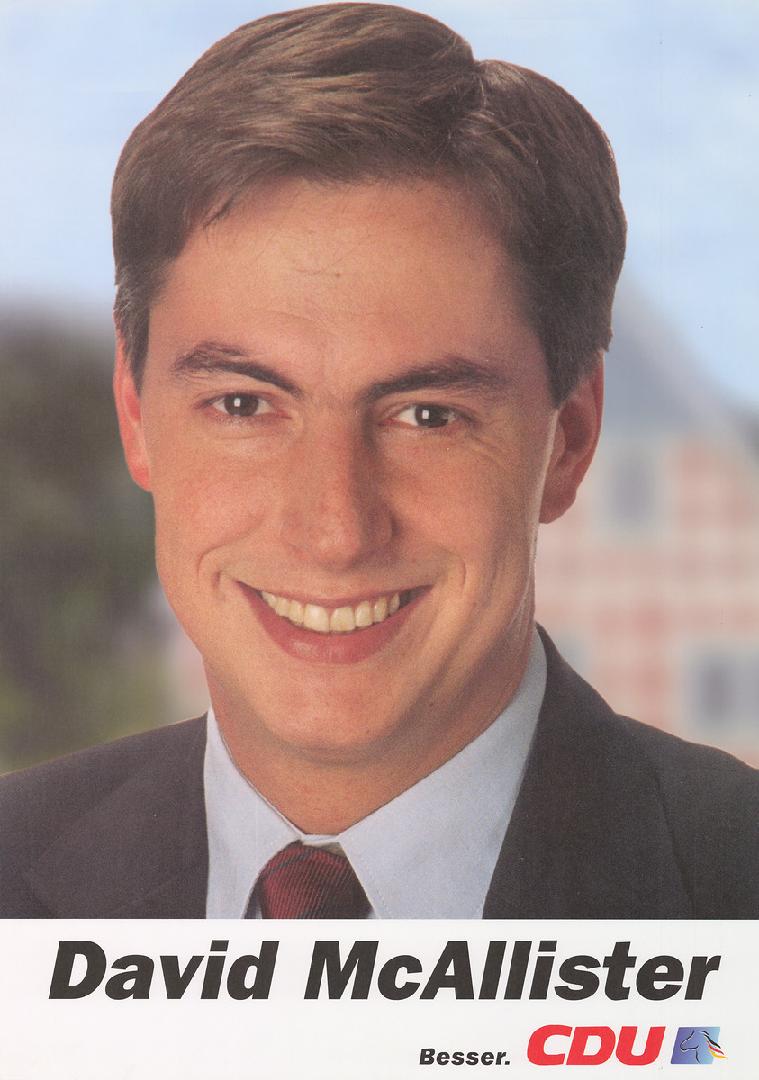 David McAllister wird am 12. Januar 1971 in Berlin geboren und verbringt hier zusammen mit seinen beiden älteren Schwestern den größten Teil seiner Kindheit. Sein Vater, ein schottischer Weltkriegsveteran aus Glasgow, arbeitet als Zivilbeamter bei den britischen Streitkräften in der geteilten Stadt. Die deutsche Mutter ist Lehrerin. Nach der Pensionierung des Vaters zieht die Familie 1982 nach Bad Bederkesa ins ländliche Niedersachsen. Hier beginnt McAllisters politische Laufbahn und hier ist er bis heute verwurzelt. Bis zum Abitur 1989 besucht er das Niedersächsische Internatsgymnasium in Bad Bederkesa. Zu seinem 17. Geburtstag lässt er sich von seinen Eltern den CDU-Beitritt schenken, da er noch nicht die Mitgliedsbeiträge zahlen kann. Der Jungen Union gehört er da allerdings schon seit zwei Jahren an. 1991 wird er zum Vorsitzenden der JU im Kreisverband Cuxhaven gewählt. Im gleichen Jahr kandidiert er zum ersten Mal für den Kreistag, allerdings erfolglos.