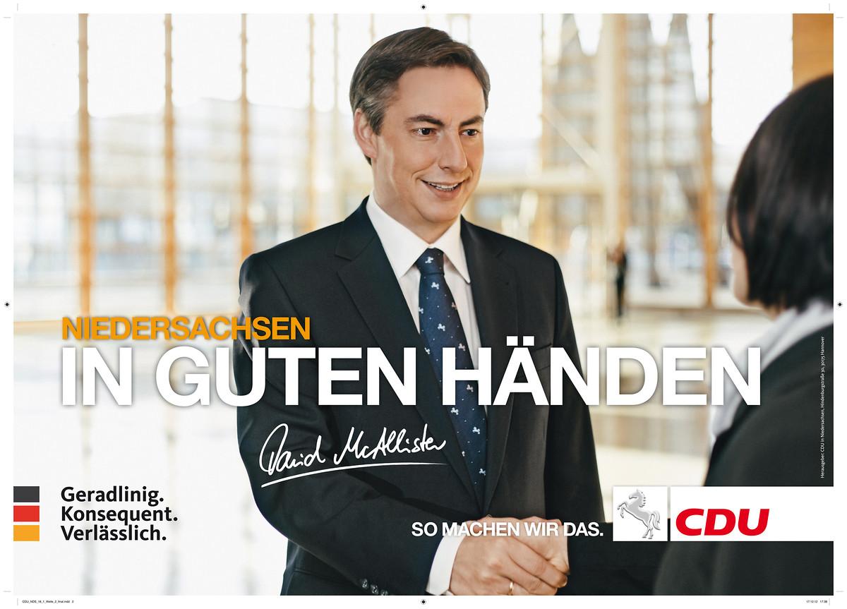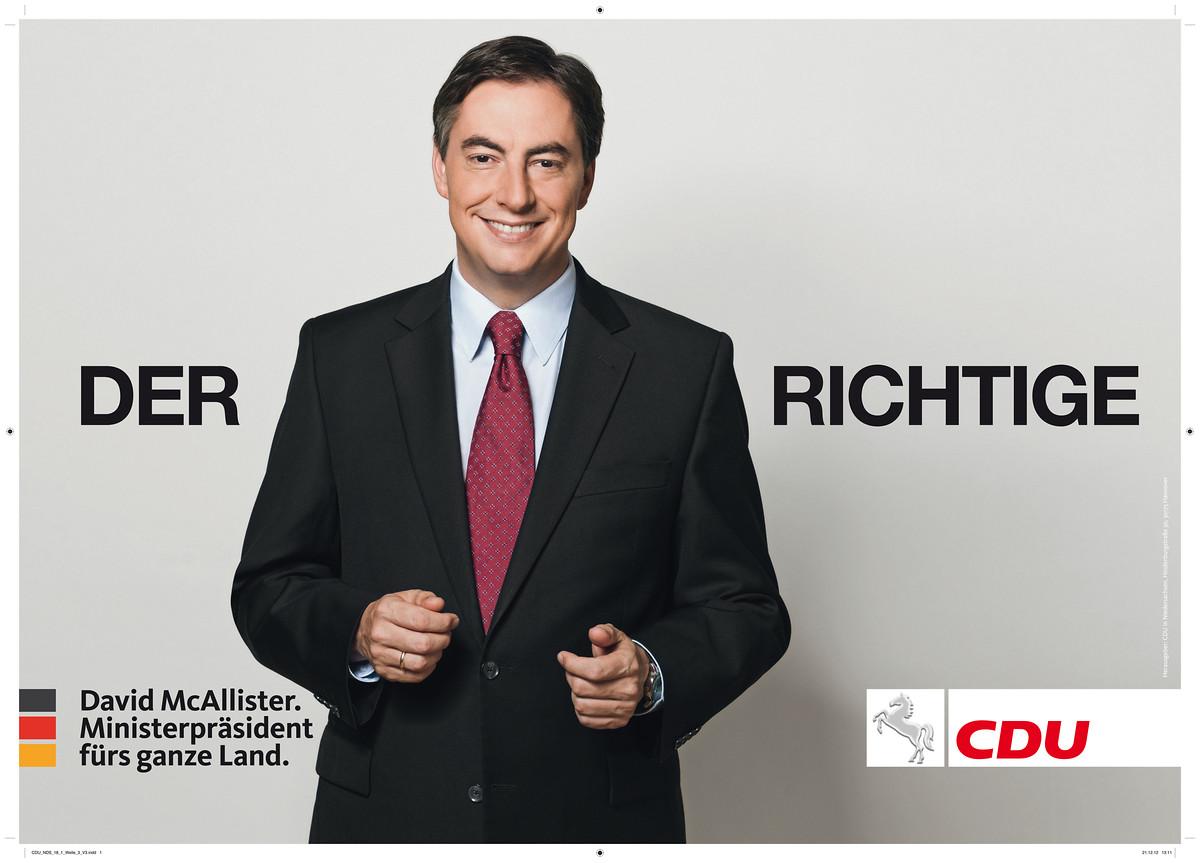 Als Wulff dann 2010 zum Bundespräsidenten gewählt wird, steht McAllister als designierter Nachfolger fest. Am 1. Juli 2010 wird er zum neuen Niedersächsischen Ministerpräsidenten gewählt. Mit 39 Jahren ist er der jüngste Landesvater in der Geschichte Niedersachsens – und der erste mit doppelter Staatsbürgerschaft. McAllister setzt die christlich-liberale Regierungskoalition fort und übernimmt auch das Kabinett seines Vorgängers. Als Ministerpräsident versucht er die enge Bindung an Land und Leute und seine offene Art beizubehalten. Durch gute Kontakte zur Bundesregierung, insbesondere zu Bundeskanzlerin Angela Merkel, gelingt es ihm trotz der Bundeswehrreform viele Standorte in Niedersachsen zu erhalten.