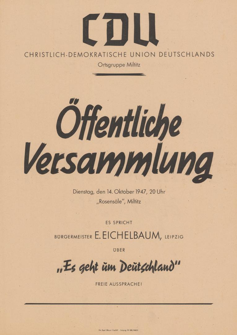 Der Erfurter Parteitag der CDU im September 1948 und die Wahl Otto Nuschkes bildeten den Schlusspunkt der Existenz der CDU als eigenständiger politischer Kraft in der SBZ. Gleichzeitig ging die SMAD gegen die noch verbliebenen „reaktionären Zentren“ der Partei vor, zu denen auch Leipzig gezählt wurde. Nachdem Eichelbaum im September 1948 jegliche politische Betätigung verboten wurde, flüchtete er Mitte Oktober 1948 über Berlin nach Bonn.