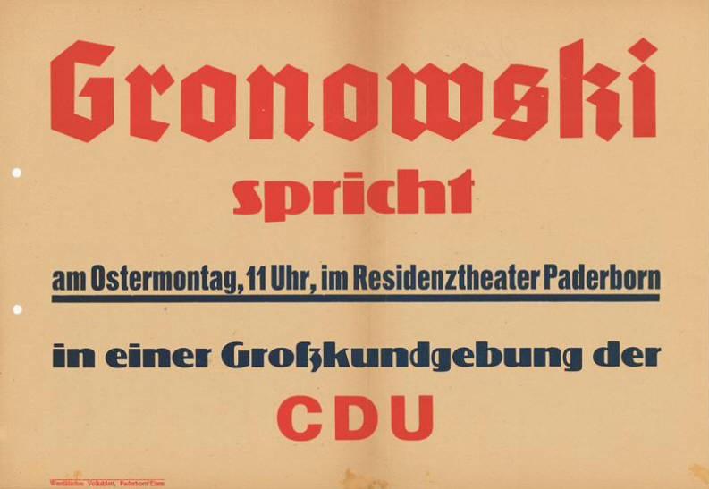 In seinem vor den Kommunalwahlen vom September 1946 veröffentlichtem Aufruf „Warum ich dabei bin“ begründete er die Notwendigkeit einer Parteineugründung, welche „[d]ie Vereinigung der evangelischen und katholischen Christen auf politischem, sozialem, wirtschaftlichem und kulturellem Gebiet“ ermögliche. Gronowski betrachtete den überkonfessionellen Ansatz der CDU als politisch unerlässlich, denn „[d]er Streit Rom-Wittenberg ist Gott sei Dank erstickt“, wie er in einem Brief an den nunmehr in den Vereinigten Staaten weilenden Heinrich Brüning formulierte.