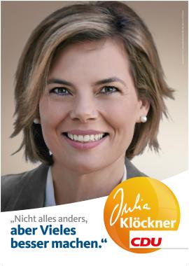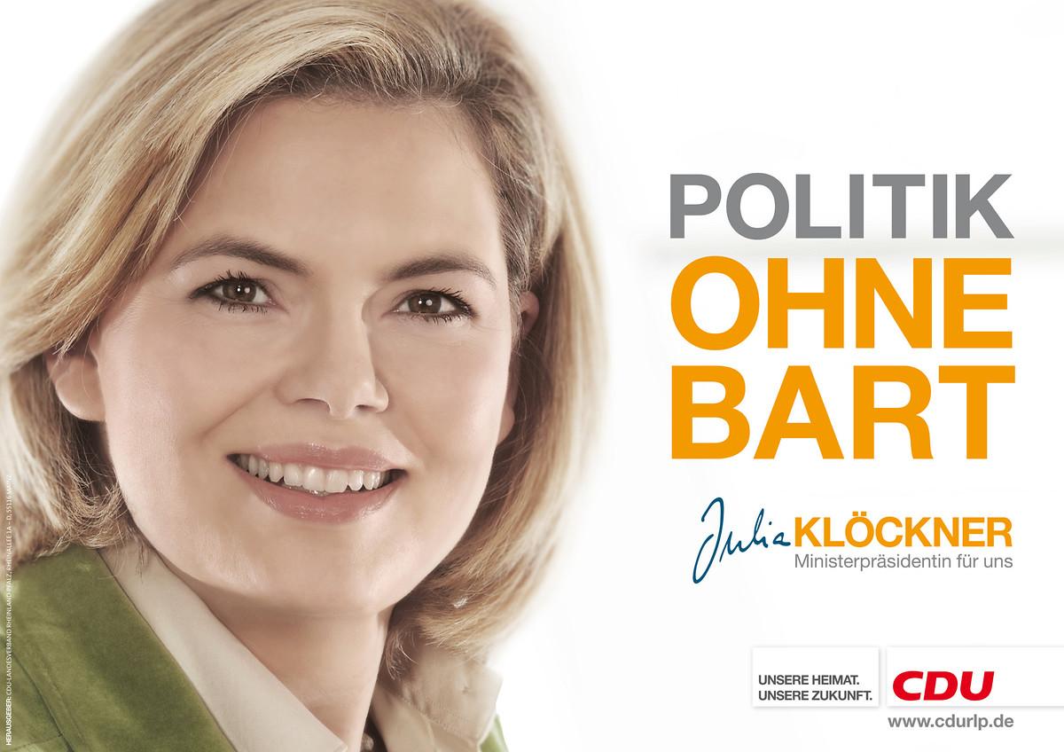 Julia Klöckner etablierte einen neuen Politikstil, profitierte im Umgang mit den Medien von den Erfahrungen, die sie 1995/96 als Deutsche Weinkönigin sowie bei ihrer Tätigkeit als Journalistin hatte sammeln können, verstand es, „mit de Leut zu schwätze“. Im Landtagswahlkampf präsentierte sie sich als Gegenmodell zu Kurt Beck und warb für eine „Politik ohne Bart“, für „Zukunft statt Vergangenheit“.