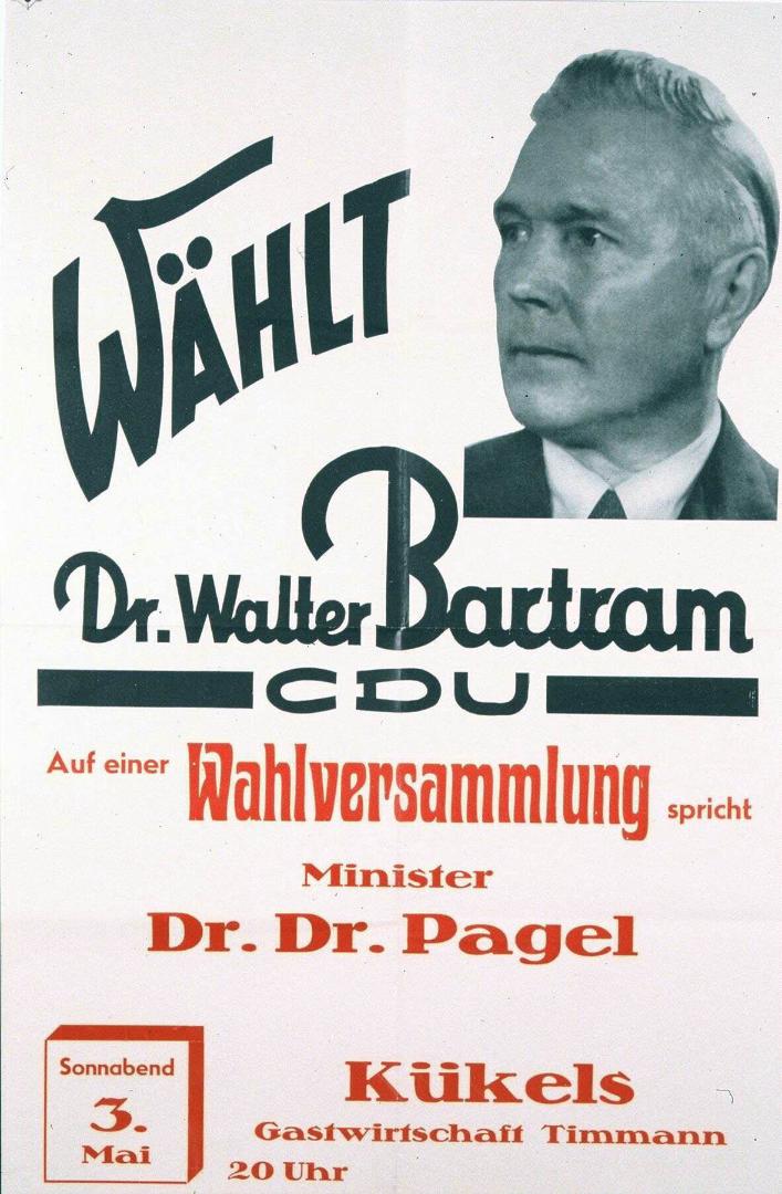 Bartram trat 1946 in die CDU ein und übernahm 1950 den Vorsitz des Kreisverbandes Neumünster. Bei der schleswig-holsteinischen Landtagswahl am 9. Juli 1950 erreichte der kurz zuvor gegründete Bund der Heimatvertriebenen und Entrechteten (BHE) auf Anhieb 23,4 Prozent (15 Sitze). Deshalb konnten weder die SPD (19 Sitze) noch der Deutsche Wahlblock (CDU, FDP und DP, 31 Sitze) ohne den BHE eine Regierung bilden. Zwar einigten sich Wahlblock und BHE grundsätzlich auf eine Koalition, doch lehnte der BHE den vom Wahlblock vorgeschlagenen Kandidaten für das Amt des Ministerpräsidenten, Dr. Paul Pagel (CDU), ab. Trotzdem versuchte der Deutsche Wahlblock in der ersten Sitzung des Landtages am 7. August 1950 Pagel zum Ministerpräsidenten wählen zu lassen. Da der BHE bei seiner Ablehnung blieb, erhielt Pagel aber nicht die erforderliche Mehrheit. Der Wahlblock rückte nun von Pagel ab und verständigte sich mit dem BHE am 22. August 1950 auf die Bildung einer Regierungskoalition. Auf der Suche nach einem geeigneten Ministerpräsidenten erinnerte sich der passionierte Reiter Pagel an seinen Reiterfreund aus Neumünster – Walter Bartram. Obwohl Bartram bisher kaum über politische Erfahrungen verfügte und in Schleswig-Holstein nahezu unbekannt war, gab er dem Drängen Pagels nach. Am 25. August 1950 stimmte der CDU-Landesvorstand der Nominierung Bartrams für das Amt des Ministerpräsidenten zu und ein Tag später schloss sich die Fraktion des Wahlblocks diesem Votum an.